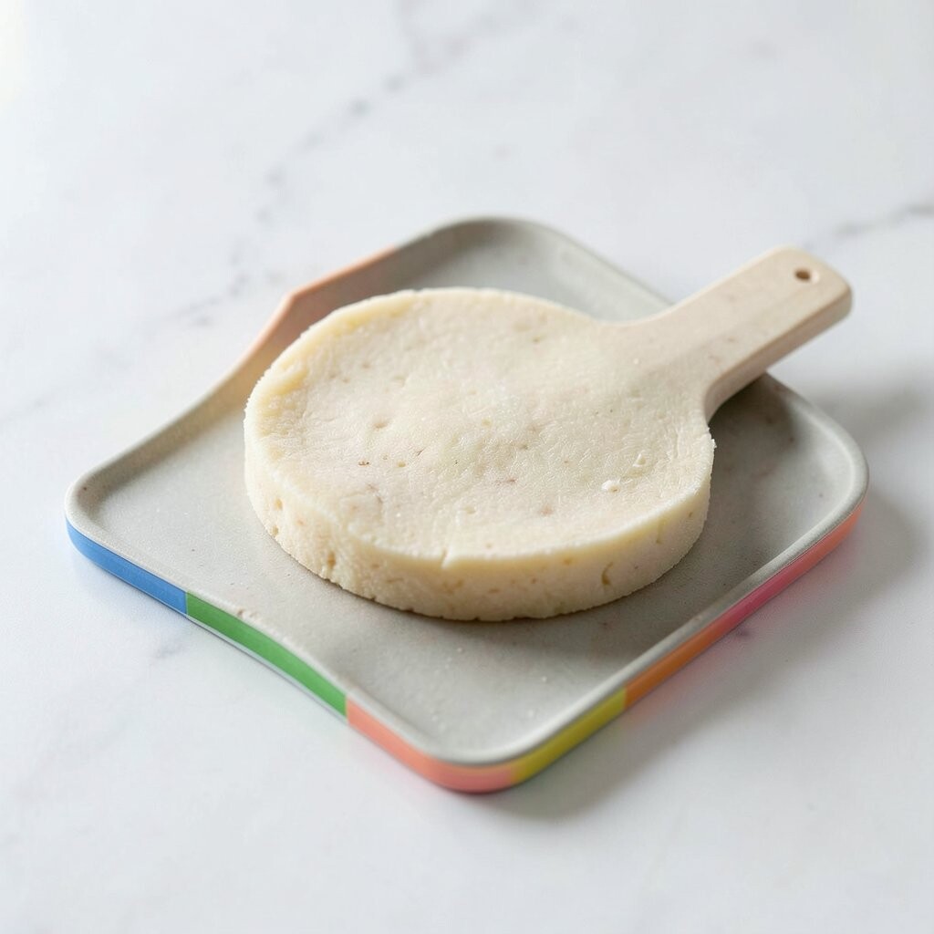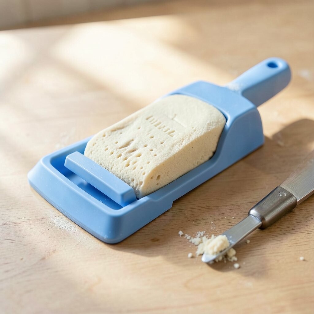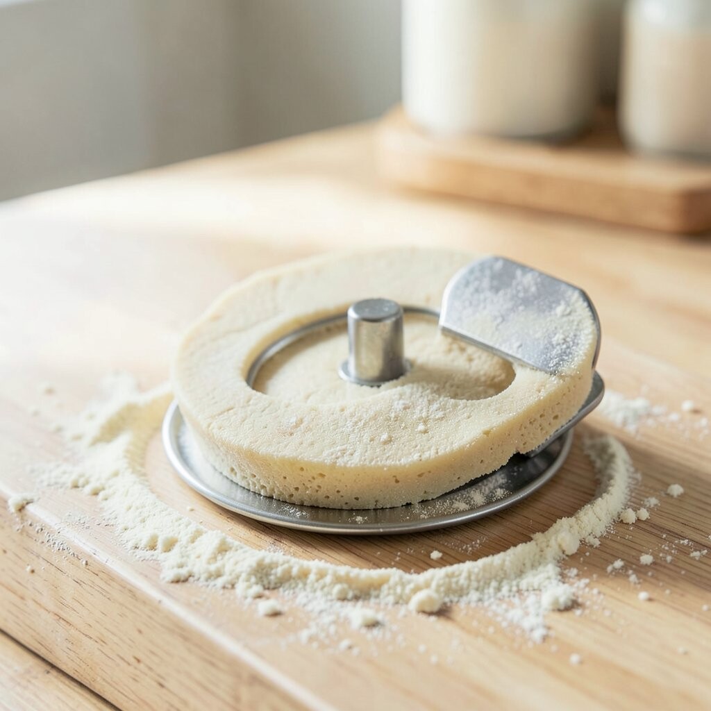 Dust your workspace with ease using a scraper that includes a built-in flour sifter. It’s a handy tool for preparing your surface.
