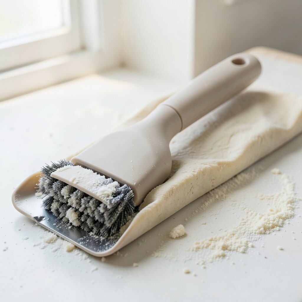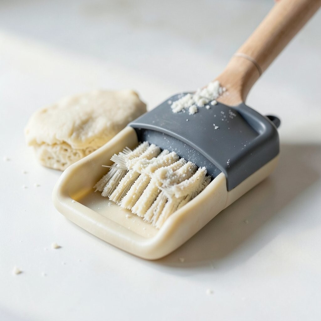 Clean as you go with a scraper that includes a built-in brush. It sweeps away flour and crumbs, keeping your workspace tidy.