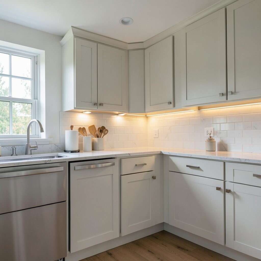 Add Under-Cabinet Lighting Under-cabinet lighting can make counters glow in the prettiest way. It helps the kitchen feel bright, clean, and a little bit fancy.