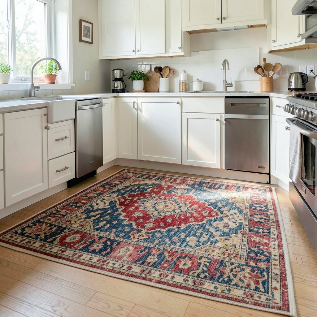 Pick a Colorful Rug for a Cozy Touch A rug can bring warmth, color, and pattern into a kitchen fast. It can make the space feel more like a happy room and less like a work zone.