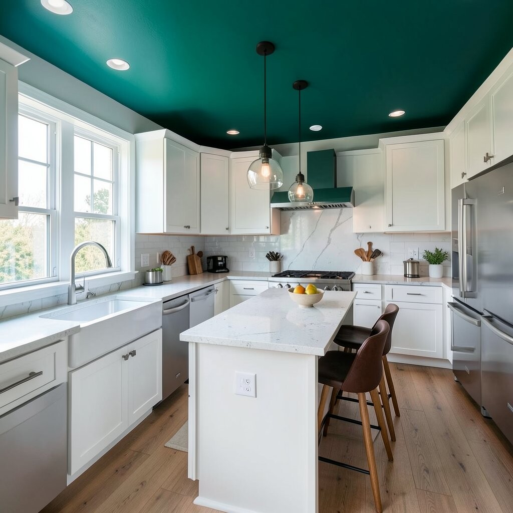 Use a Bold Ceiling Color A painted ceiling can be a fun surprise in a kitchen. Soft blue, warm clay, or even deep green overhead can make the space feel special.