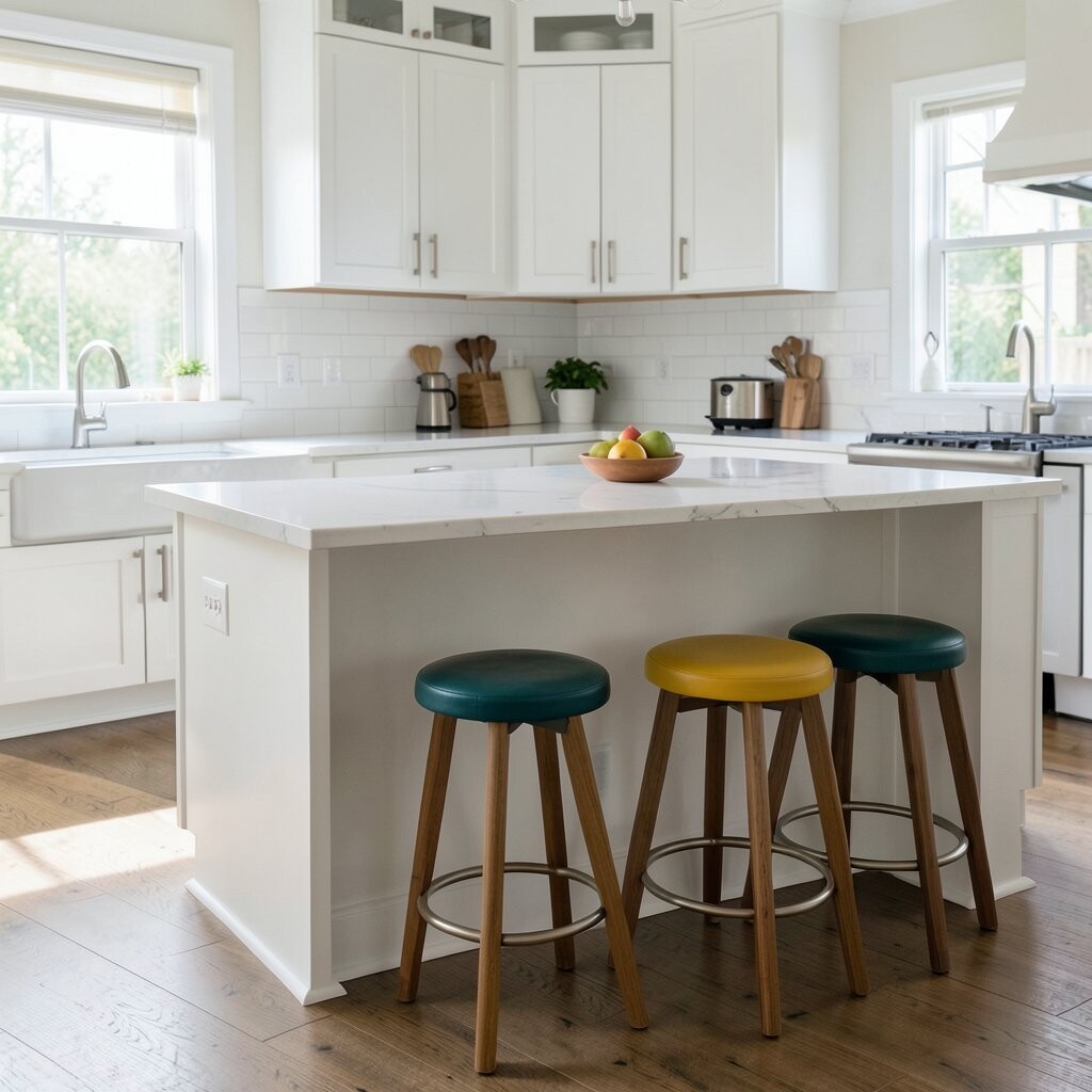 Add a Touch of Color with Bar Stools Bar stools are a fun place to add personality. A bright seat, woven texture, or curved shape can make the kitchen feel cheerful.