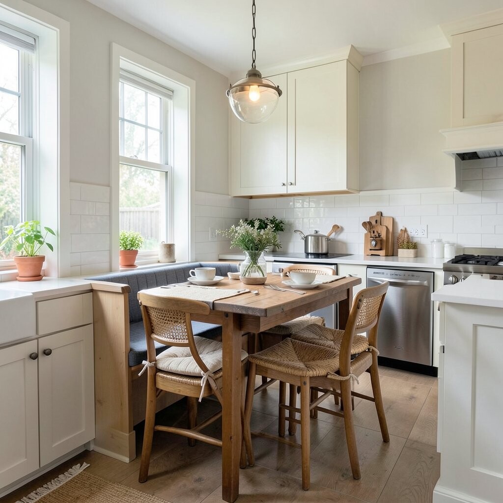 Add a Breakfast Nook with Charm A breakfast nook can make a kitchen feel sweet and inviting. A small bench, round table, and soft cushions can create a cozy corner for meals or tea.