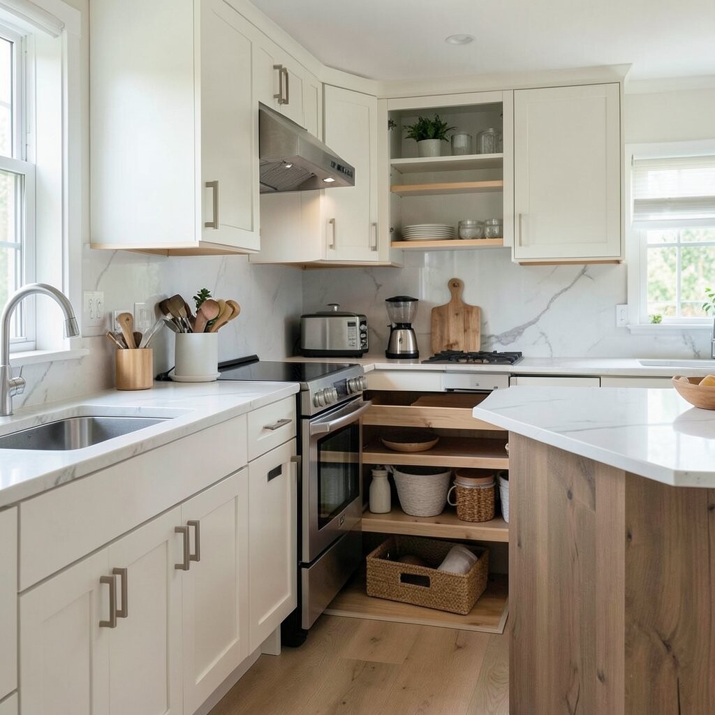 Choose Sleek Hidden Storage Hidden storage can make a kitchen feel calm and clean. Pull-out drawers, corner organizers, and tall pantry cabinets help hide the busy stuff.