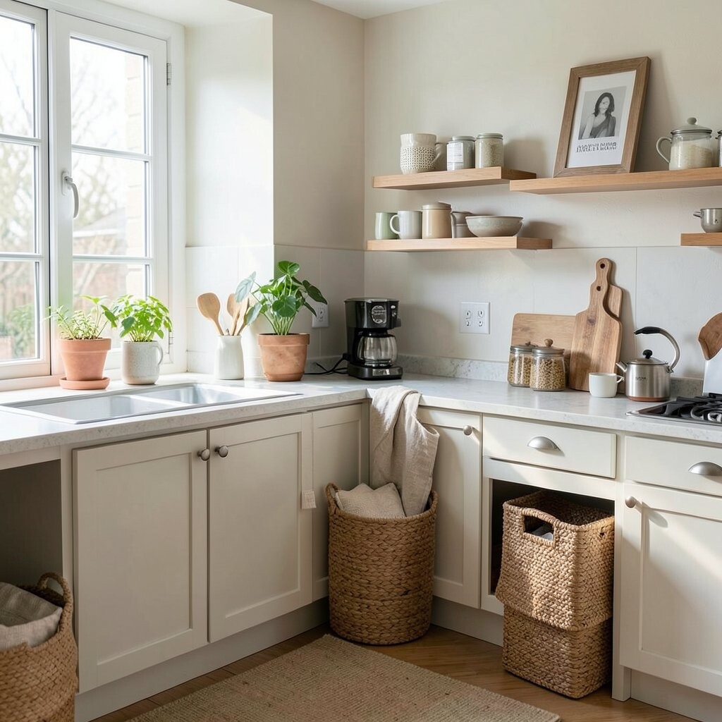 Add texture through woven baskets, wood, or stone so the room still feels rich. Neutral kitchens can be budget friendly if you keep the finishes simple and classic.
