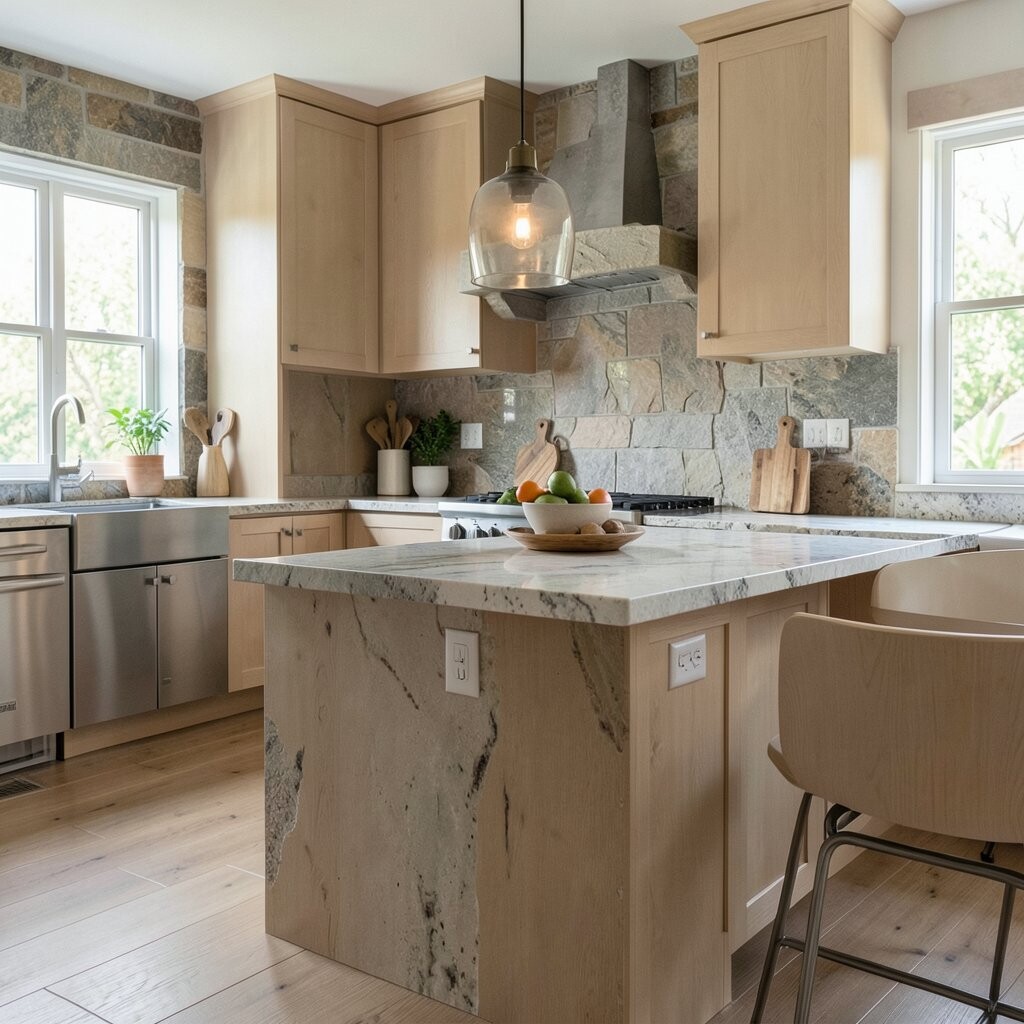 The texture and movement in stone can act like art in the room. It gives the kitchen a high-end feel that many people love right away.