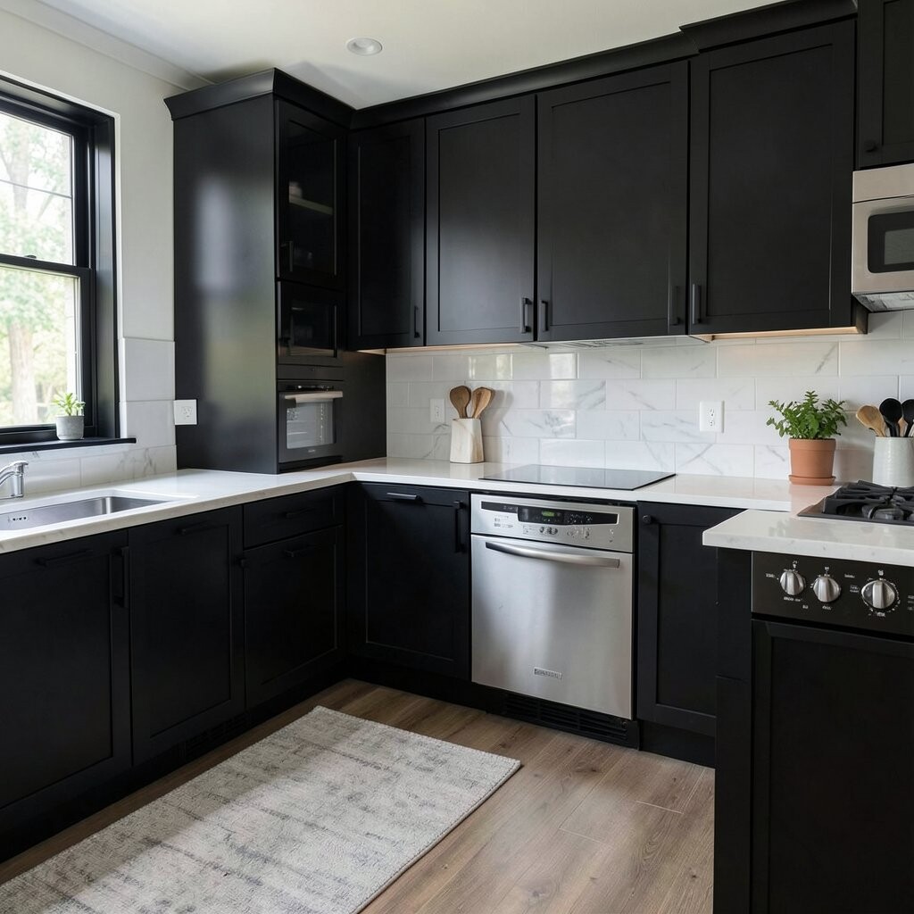 This choice works well because it adds contrast without feeling too loud. It can make light cabinets and pale walls stand out beautifully.