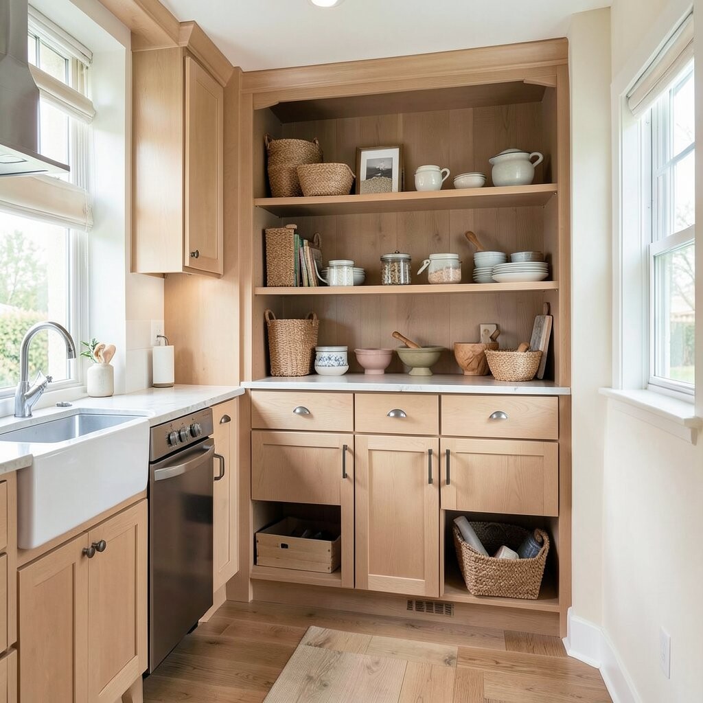 This corner adds charm and helps organize the things you use most. It also gives the kitchen a cozy, homey feeling that many people love.