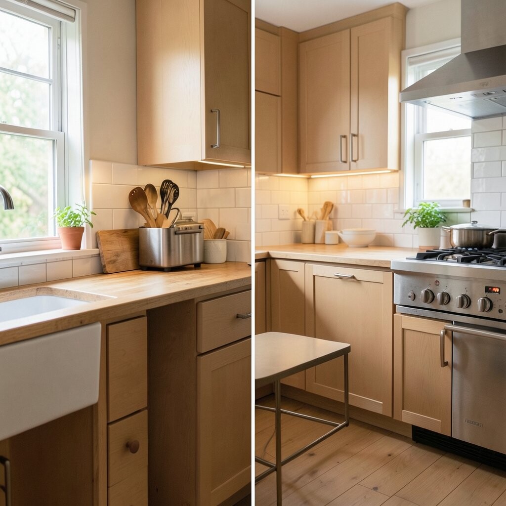 The room looks smoother when tools and food are tucked away. That clean look can make even a small kitchen feel more peaceful.