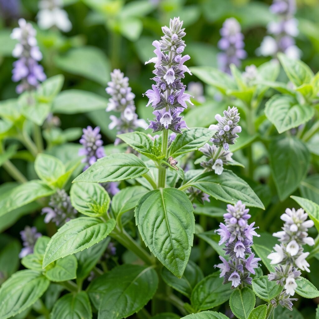 Basil flowers are small and light, often white or pale purple, and they look soft against the plant’s green leaves. They carry the same sweet-herbal scent that makes basil so loved in cooking.