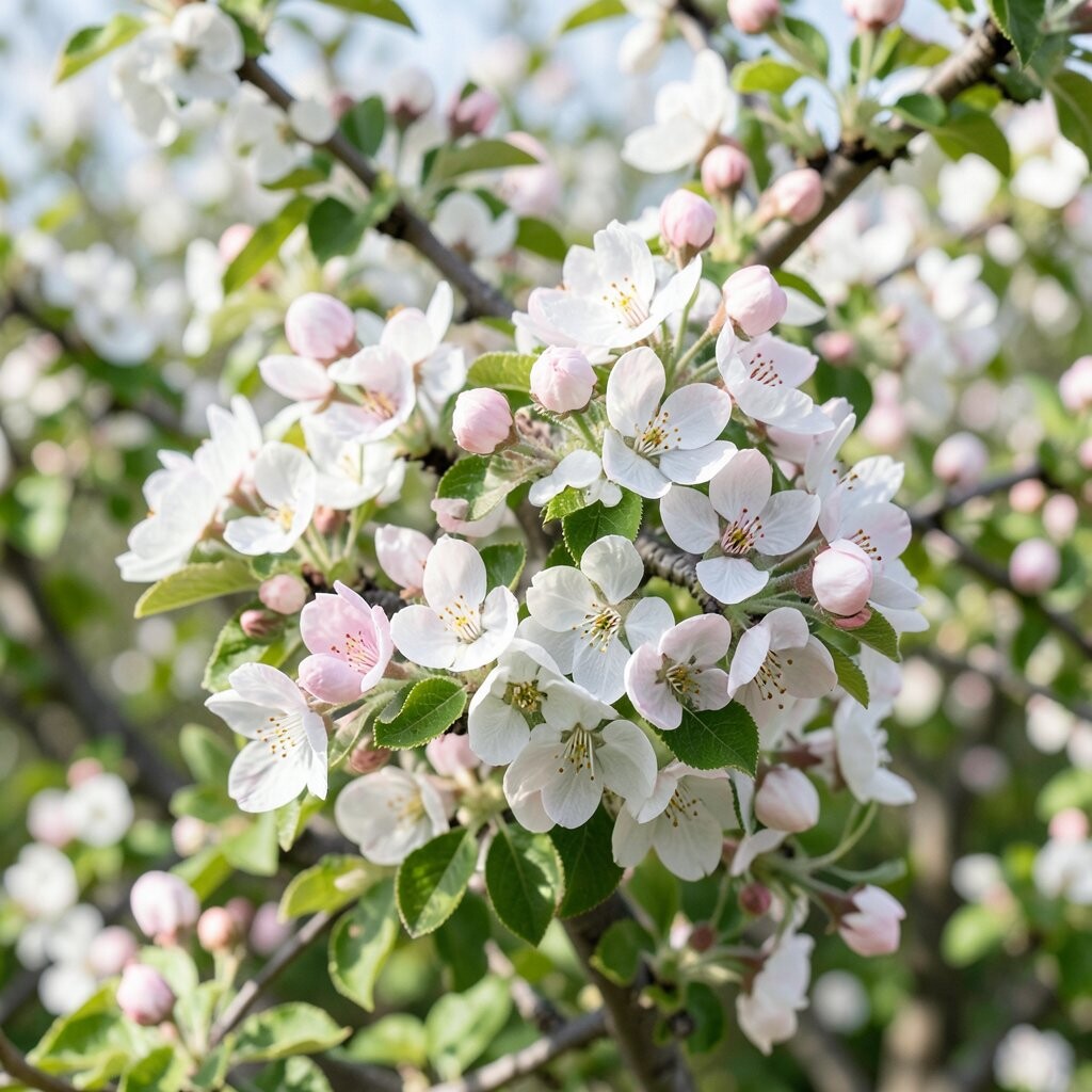 Apple blossoms are pale pink and white, with a soft, dreamy look. They feel like spring in a bowl, and they bring a light floral scent to the kitchen.