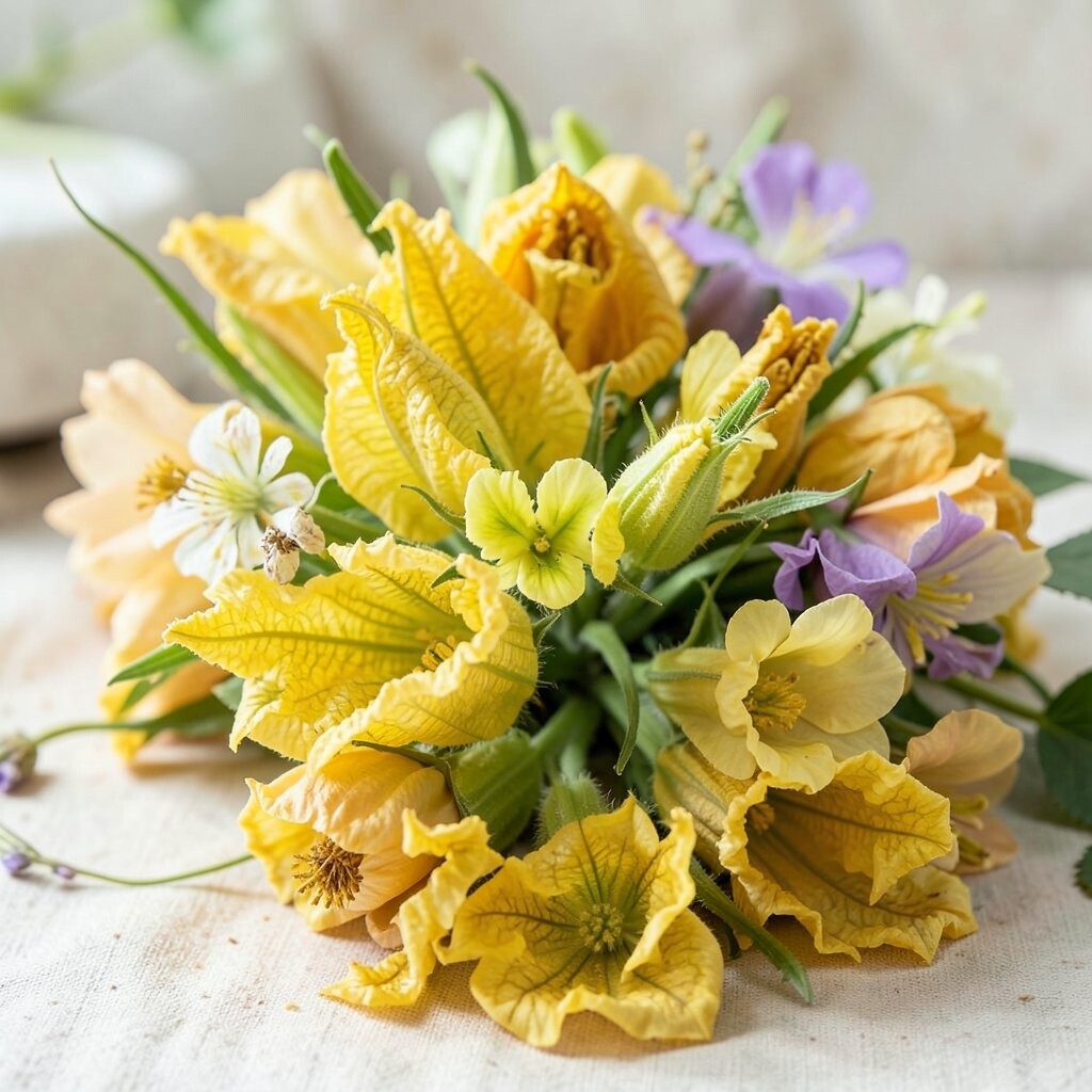 Squash blossoms are soft, pale yellow flowers with a delicate shape. They look almost like little cups waiting to be filled with something tasty.