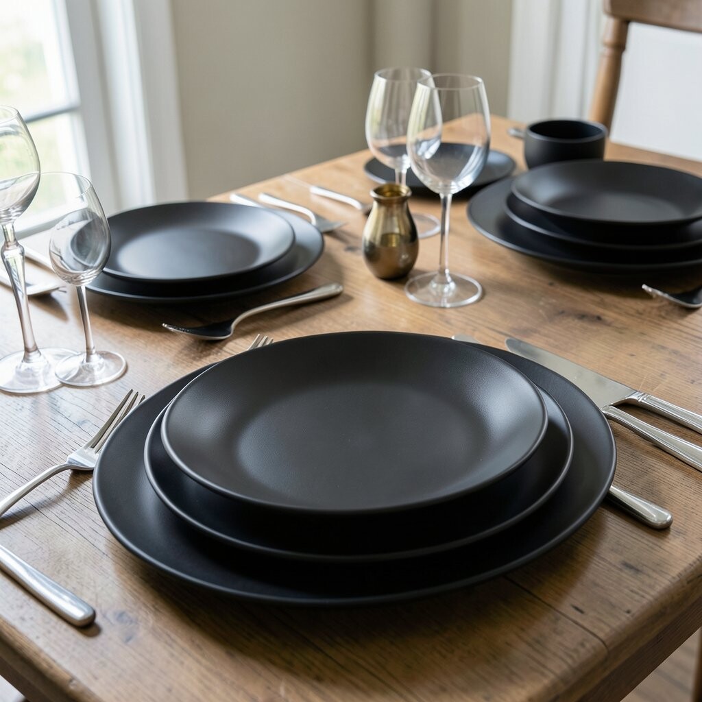Matte black plates and bowls create a bold, cool look. They make bright foods pop and give the table a modern edge.