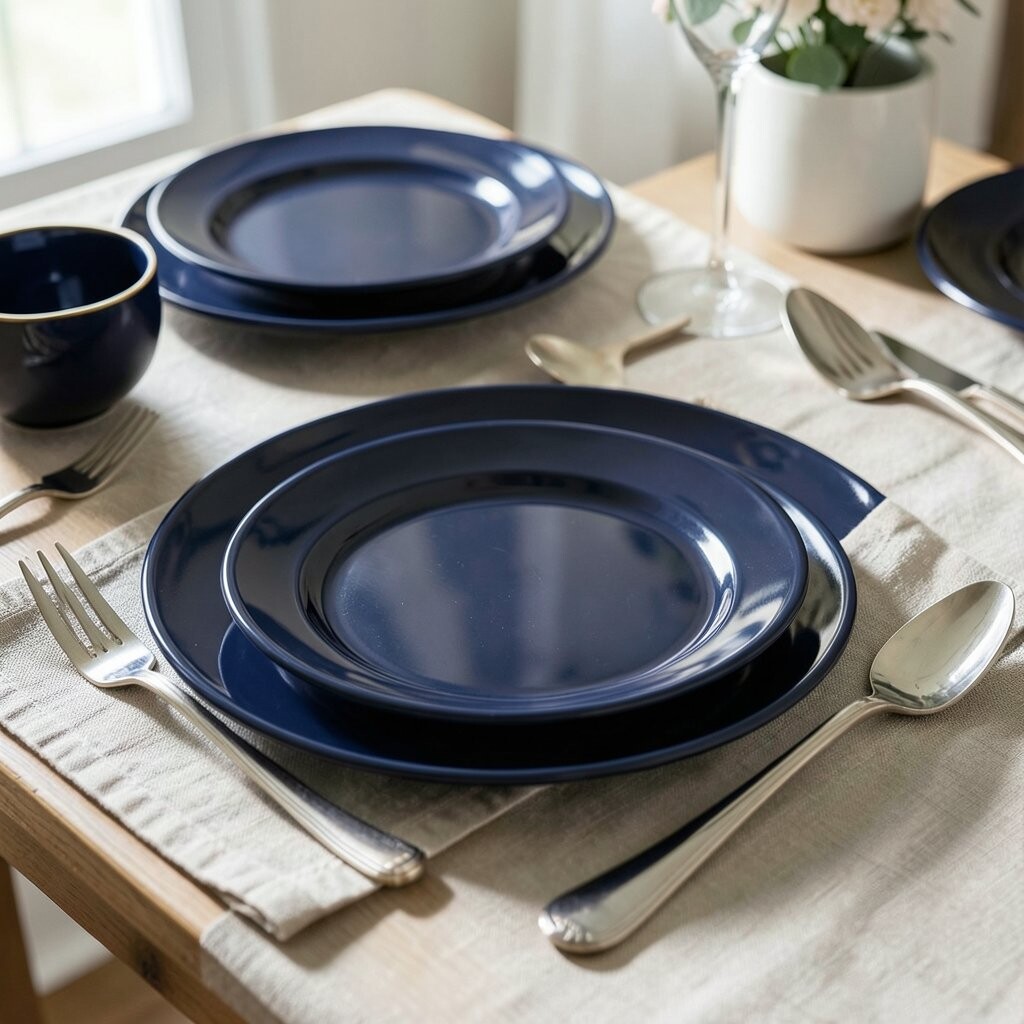 Deep navy plates bring a rich, calm mood to the table. The color feels classic and strong, like a favorite tailored jacket.