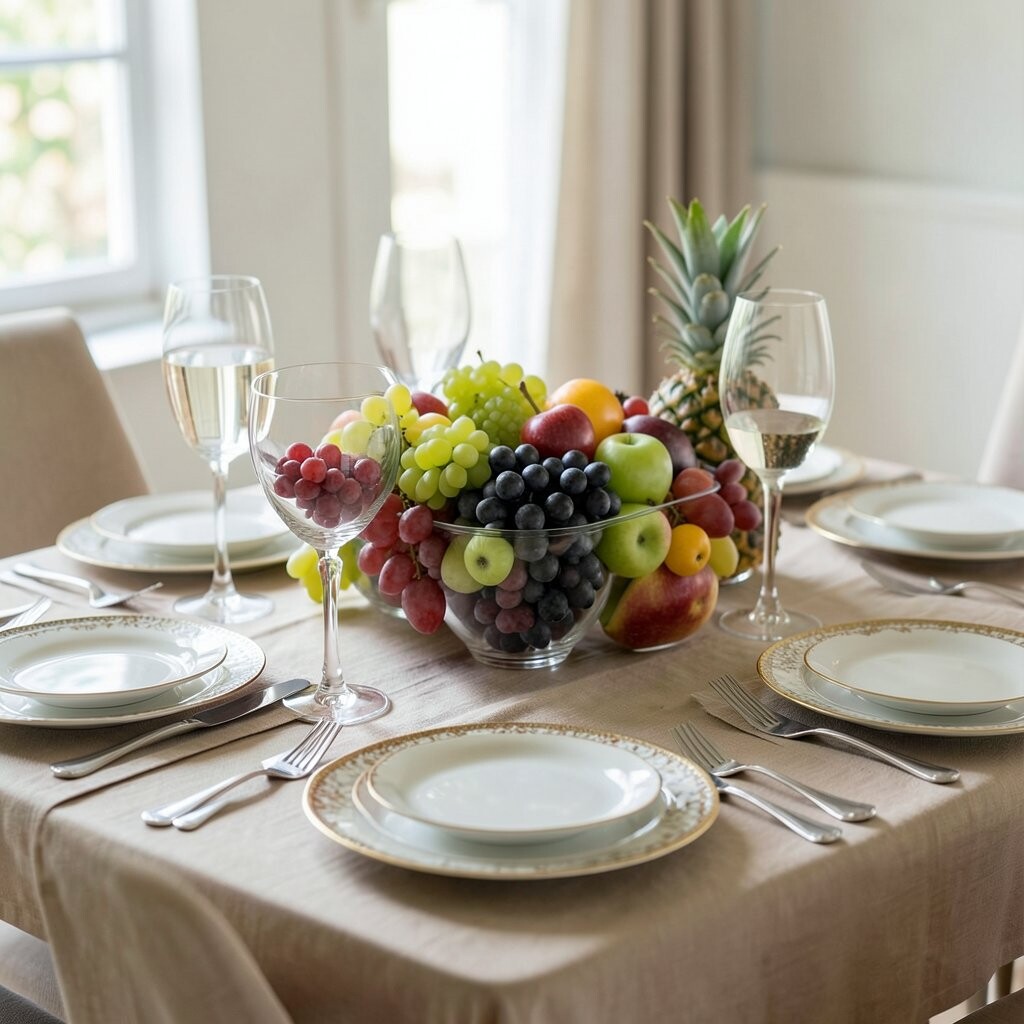 Seasonal fruit centerpieces add color, freshness, and a natural charm. Bowls of oranges, figs, pears, or grapes can look beautiful and taste great too.