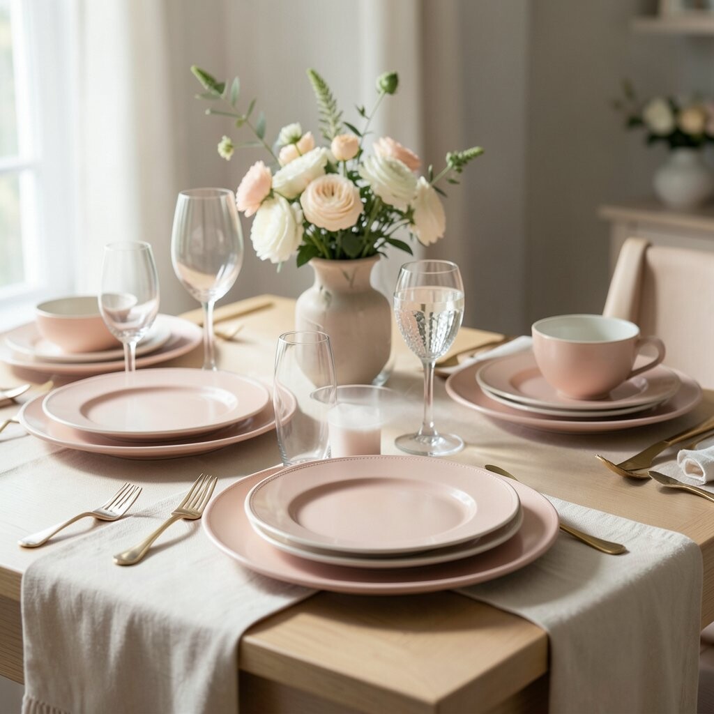Soft blush dishes and accents bring a gentle, pretty glow. The color feels sweet, calm, and a little romantic.