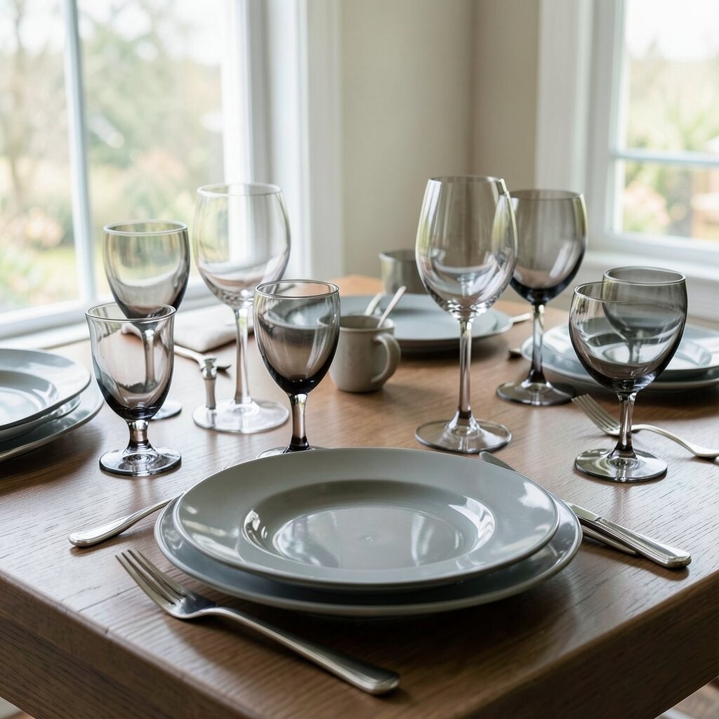 Smoky gray glassware gives the table a soft, modern mood. It has a cool tint that feels stylish without being too flashy.