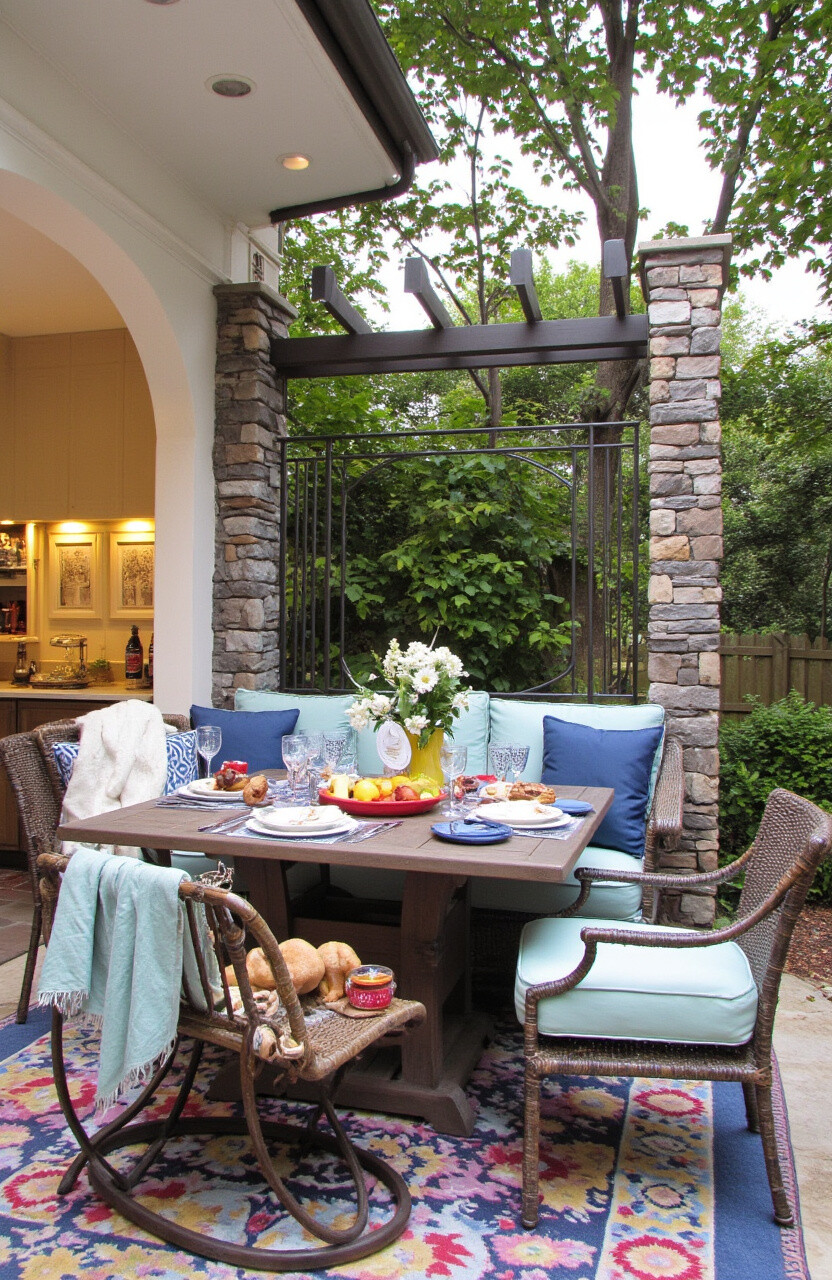 Choose weather-resistant furniture that withstands outdoor elements. Personalize your dining nook with colorful tableware and decorations. A small rug can add warmth and define the space.