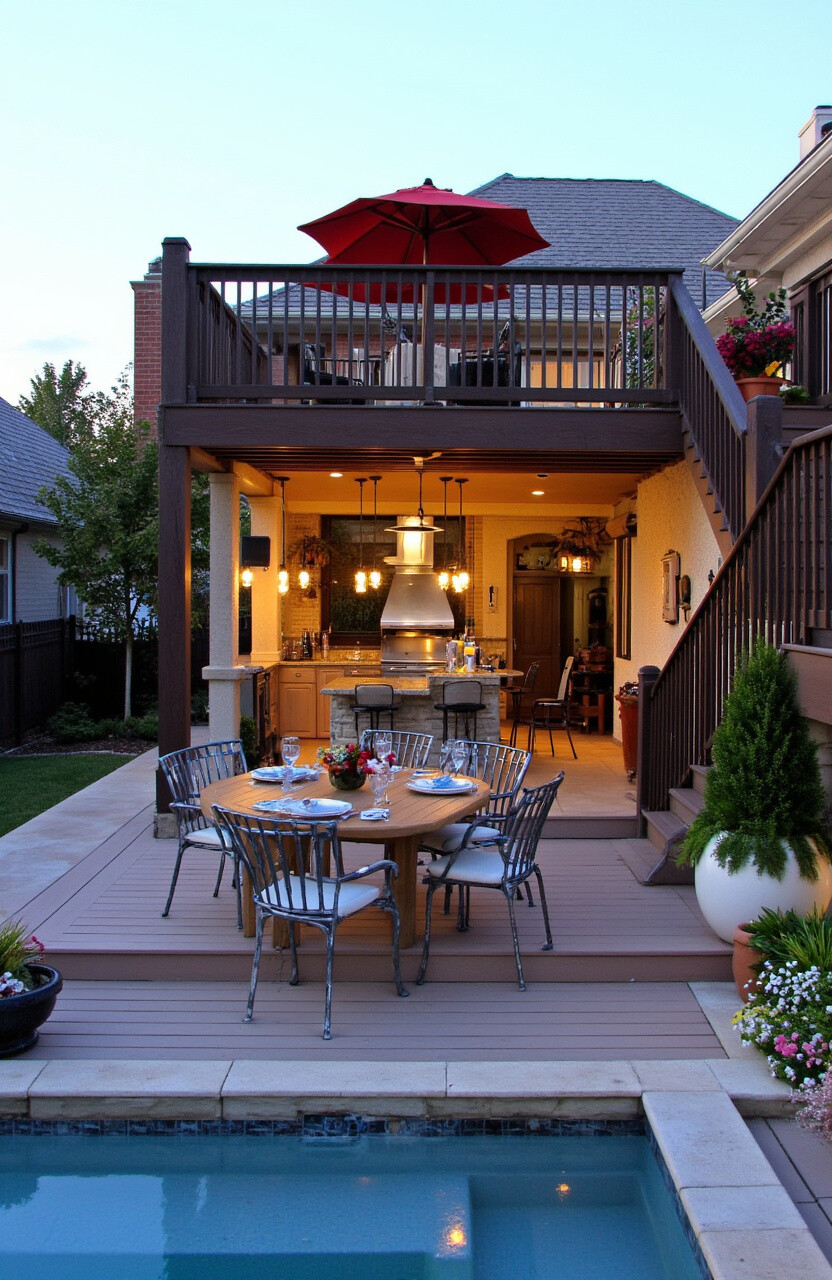 An elevated deck provides a stunning view of your backyard kitchen. It’s a perfect spot for dining, offering both style and functionality. Decks create a seamless transition from indoor to outdoor living.