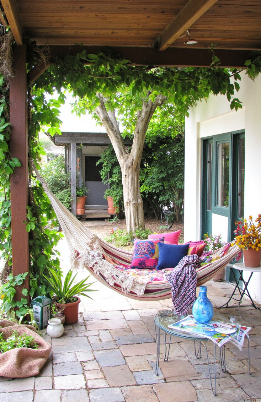 Choose a sturdy, weather-resistant hammock. Consider a stand-alone model if tree space is limited. Add colorful cushions or a throw for extra comfort.