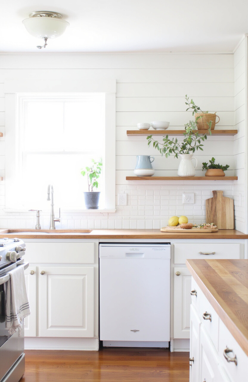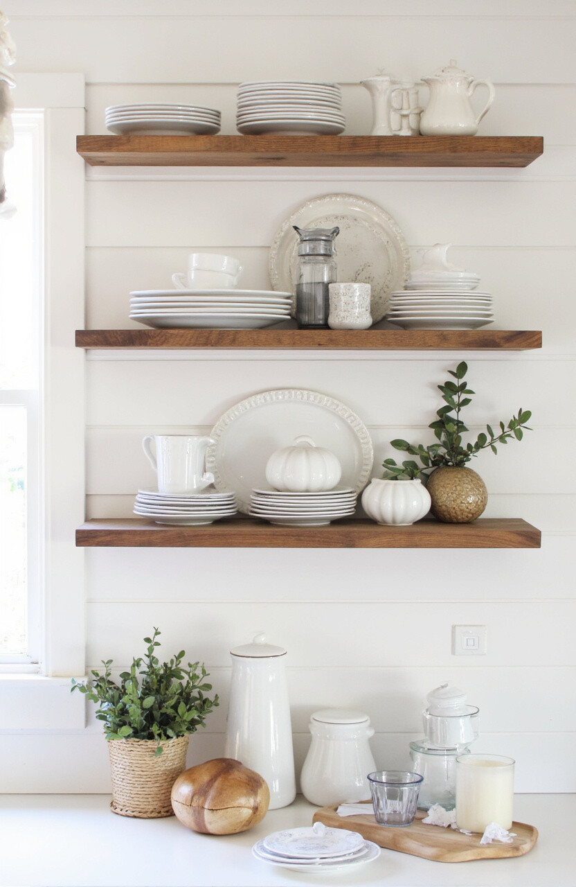 Open shelving offers a way to display your beautiful dishware and add to the farmhouse aesthetic. It creates an open, airy feel and makes everything easily accessible.