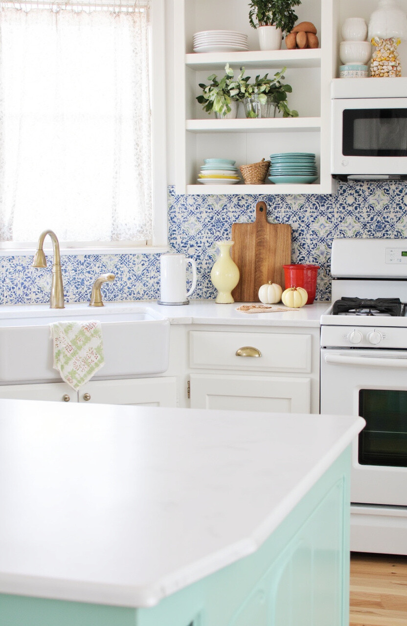 A patterned tile backsplash adds color and personality to the kitchen. Choose from geometric designs, florals, or classic subway tiles.