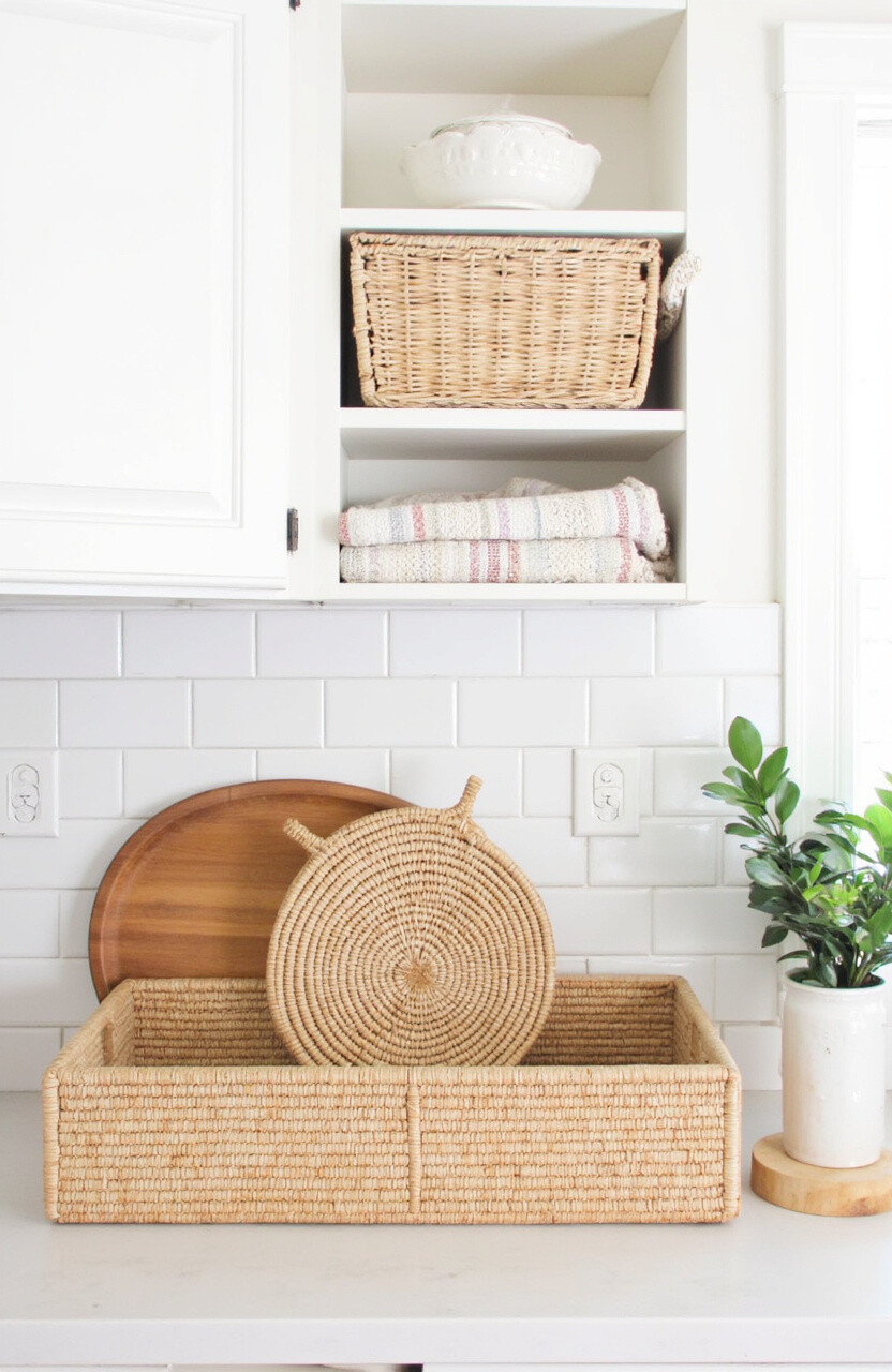 Incorporate wicker and wood accents for a touch of nature that embodies the farmhouse spirit. Items like woven baskets and wooden trays add texture and warmth.