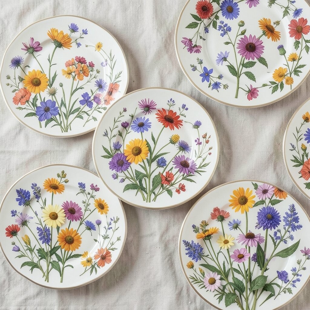 Embrace nature’s untamed beauty with whimsical wildflower plates. Each plate features a different wildflower, creating a sense of wonder.