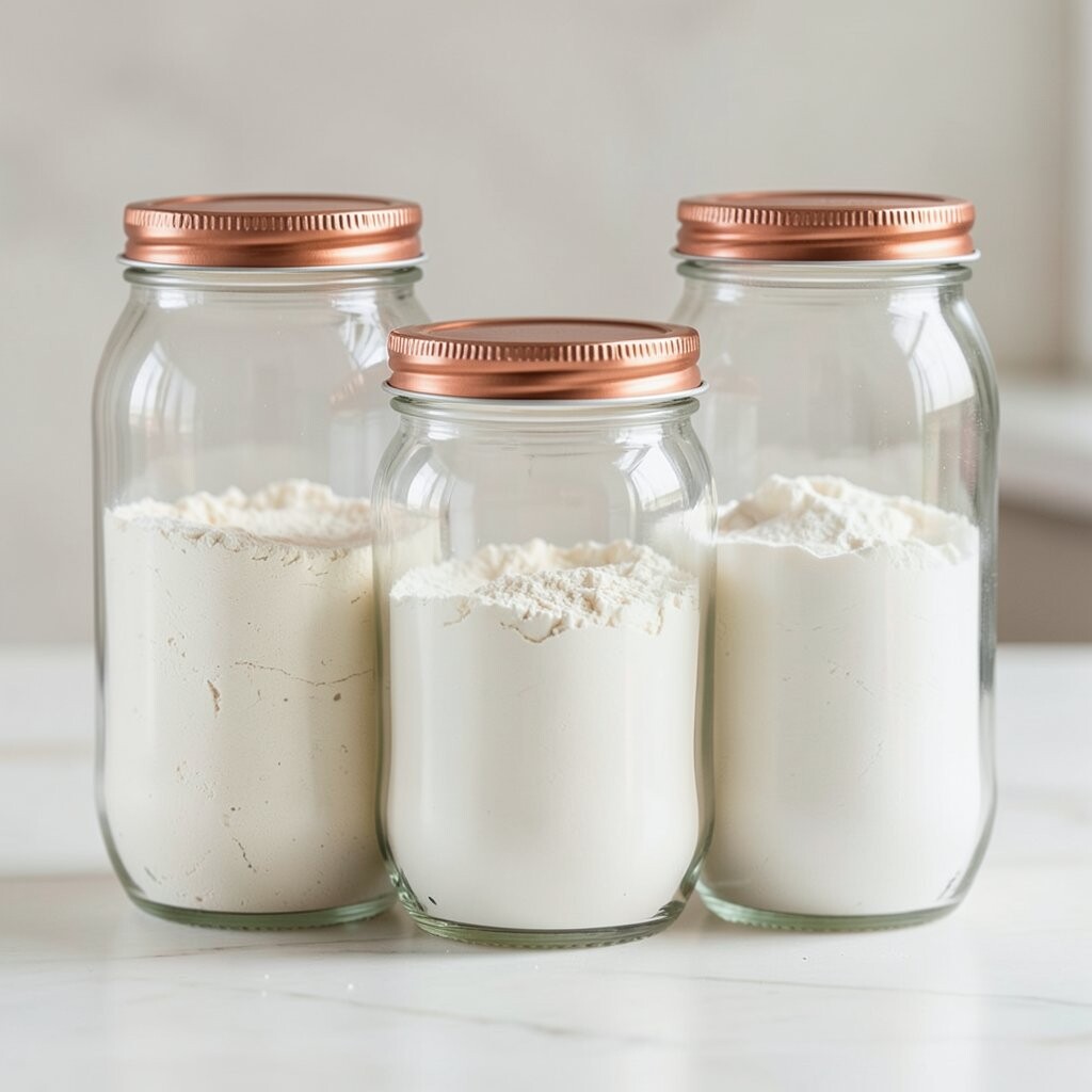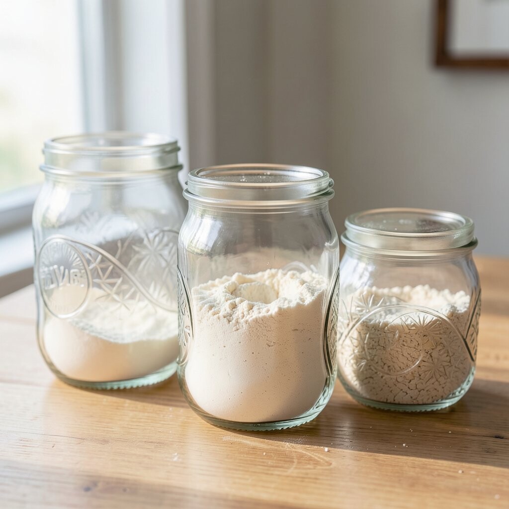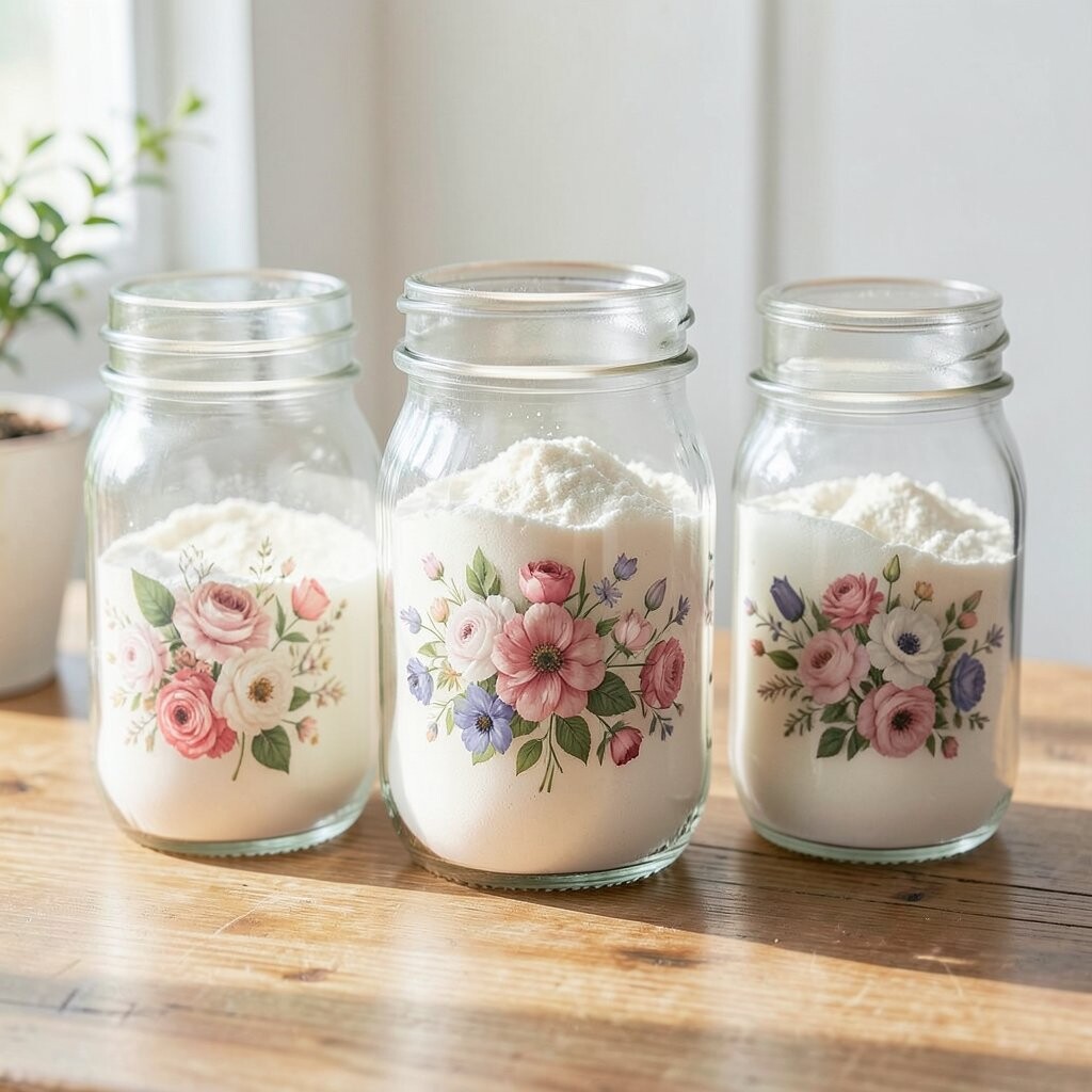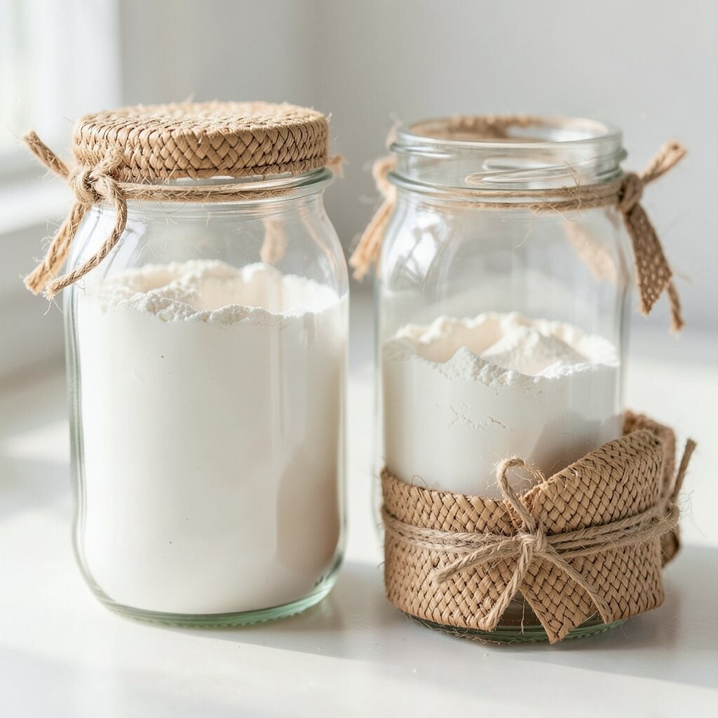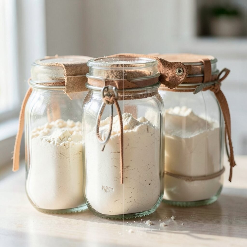 Vintage Glass Jars Imagine stepping into a cozy, old-world kitchen with vintage glass jars lining your shelves. These jars are clear, showing off the soft, powdery white of flour inside. They remind you of Grandma’s kitchen, filled with warmth and love.