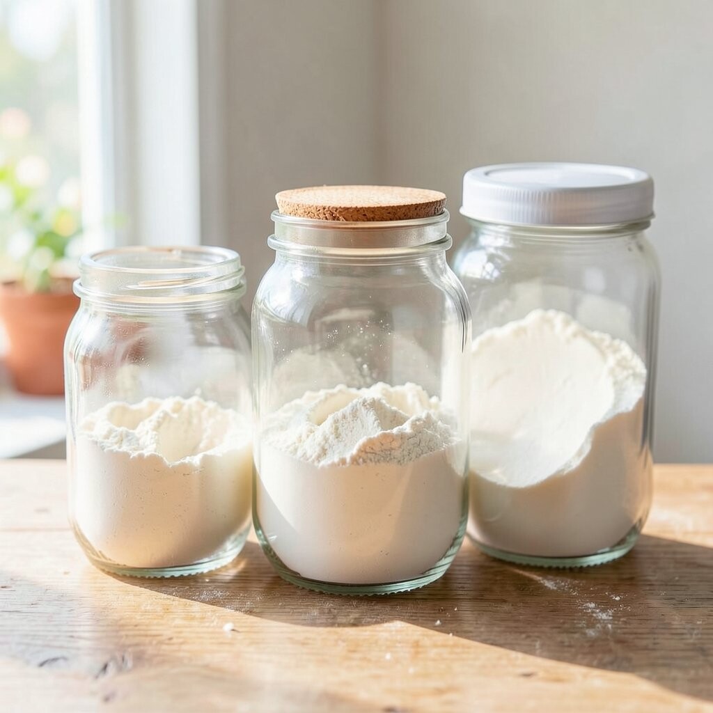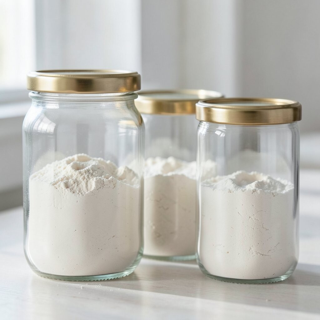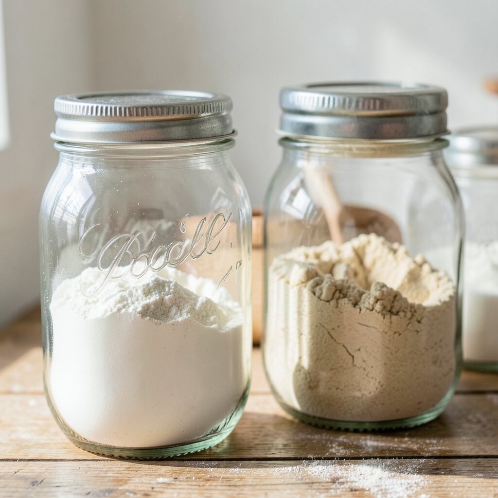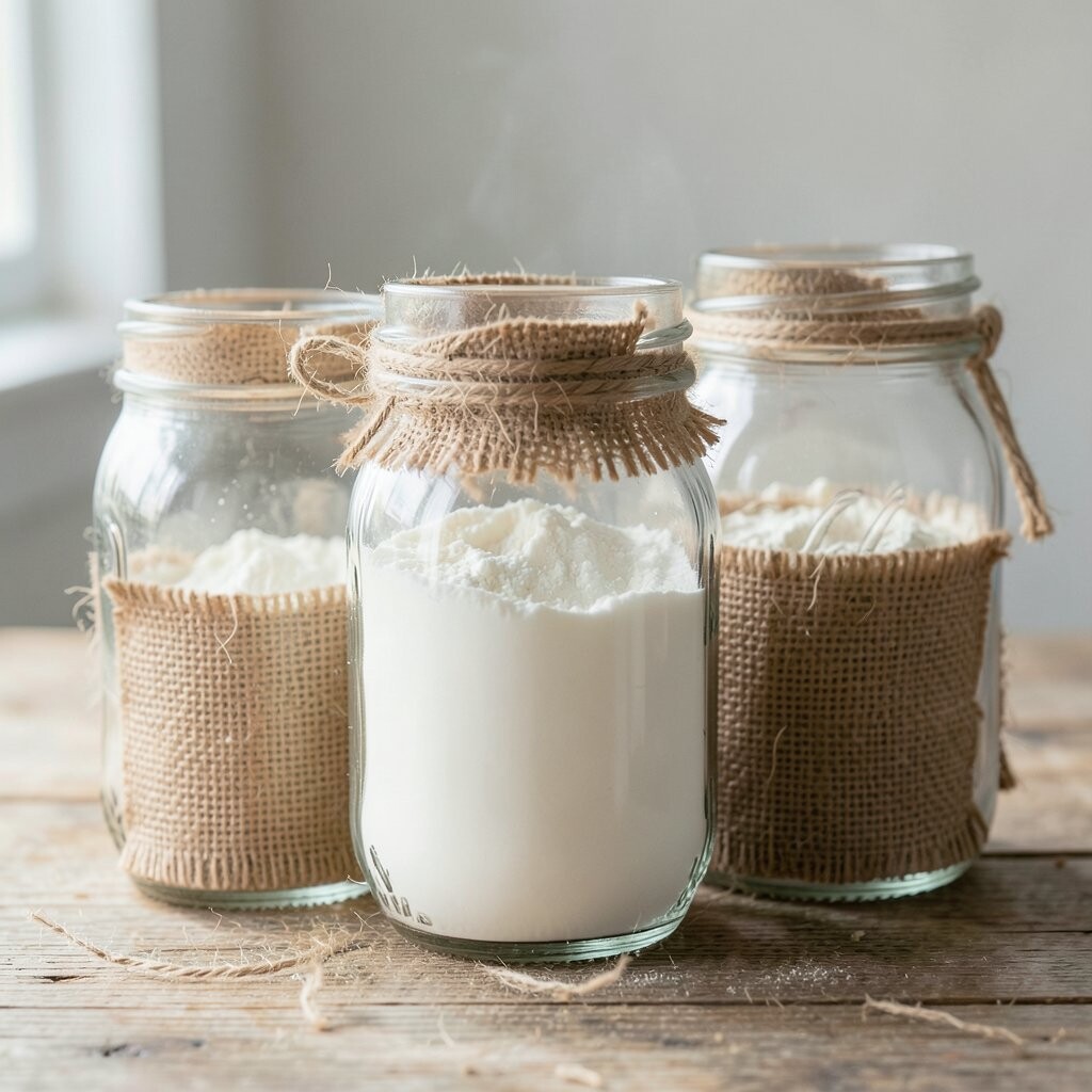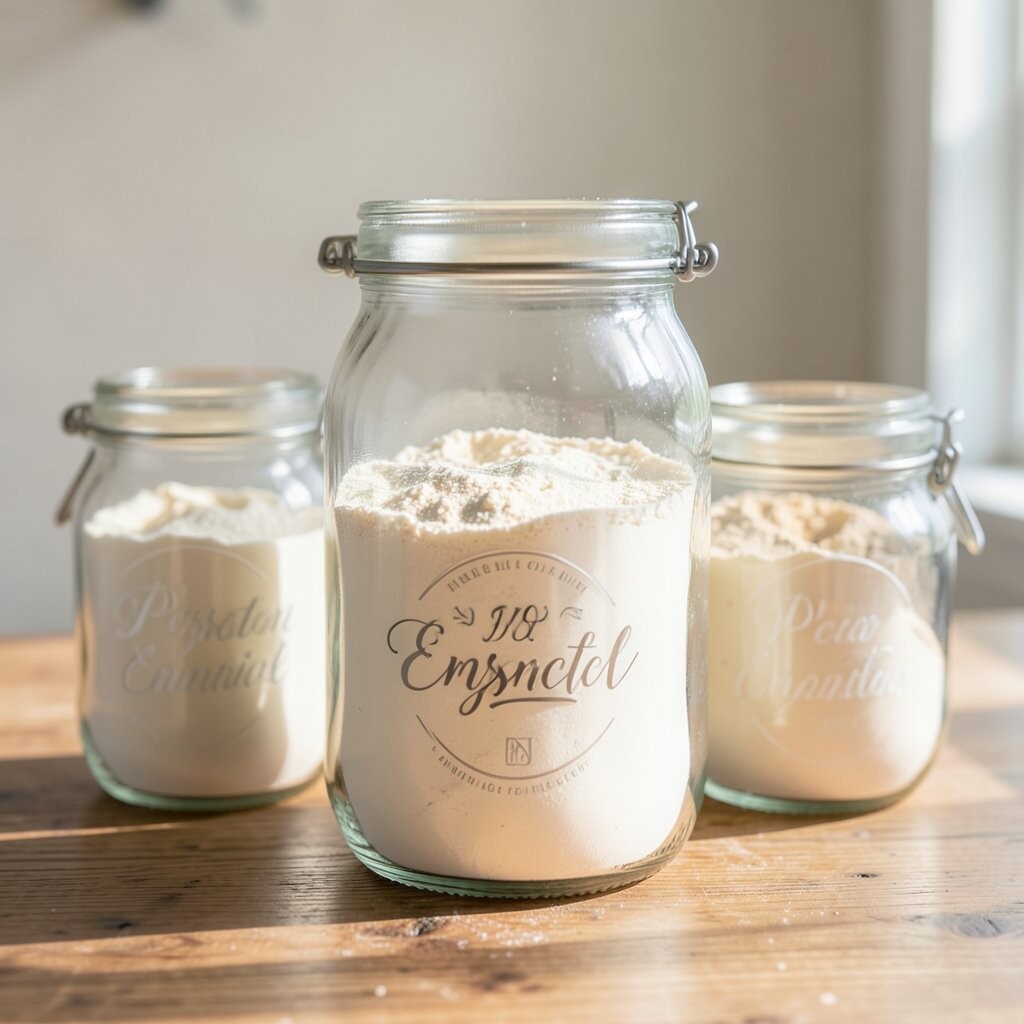 Vintage Glass Jars Imagine stepping into a cozy, old-world kitchen with vintage glass jars lining your shelves. These jars are clear, showing off the soft, powdery white of flour inside. They remind you of Grandma’s kitchen, filled with warmth and love.