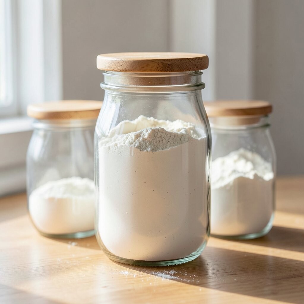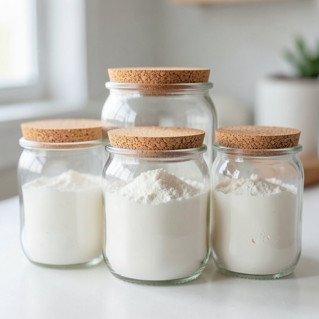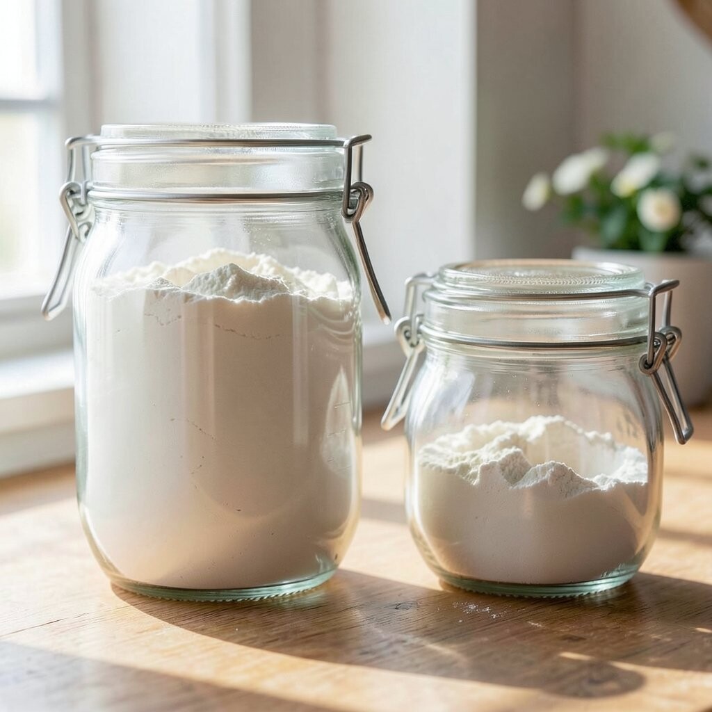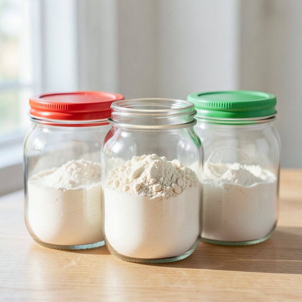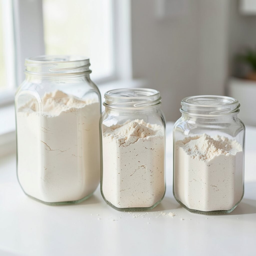 Vintage Glass Jars Imagine stepping into a cozy, old-world kitchen with vintage glass jars lining your shelves. These jars are clear, showing off the soft, powdery white of flour inside. They remind you of Grandma’s kitchen, filled with warmth and love.
