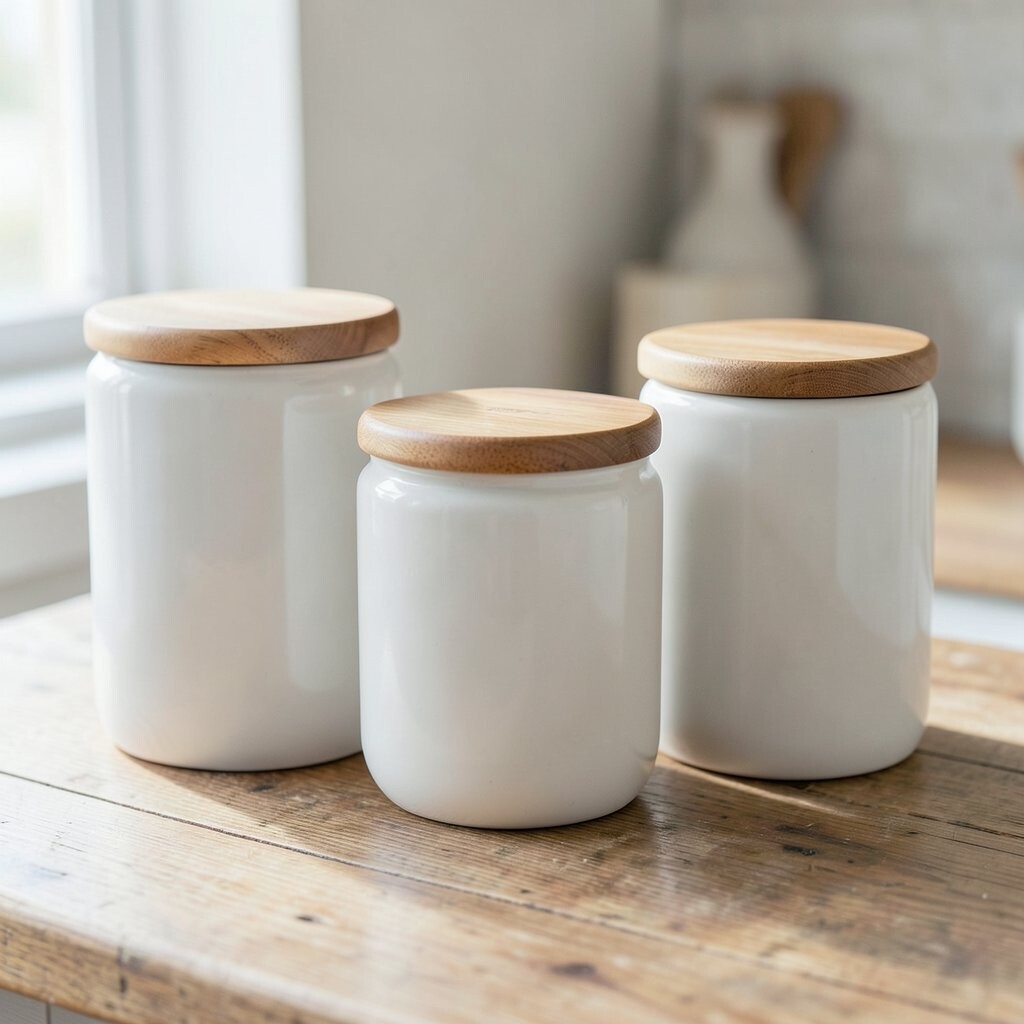Ceramic Canisters with Wooden Lids Ceramic canisters with wooden lids offer a modern and sleek look. The contrast between the smooth ceramic and natural wood is pleasing to the eye. These are perfect for a contemporary kitchen space.