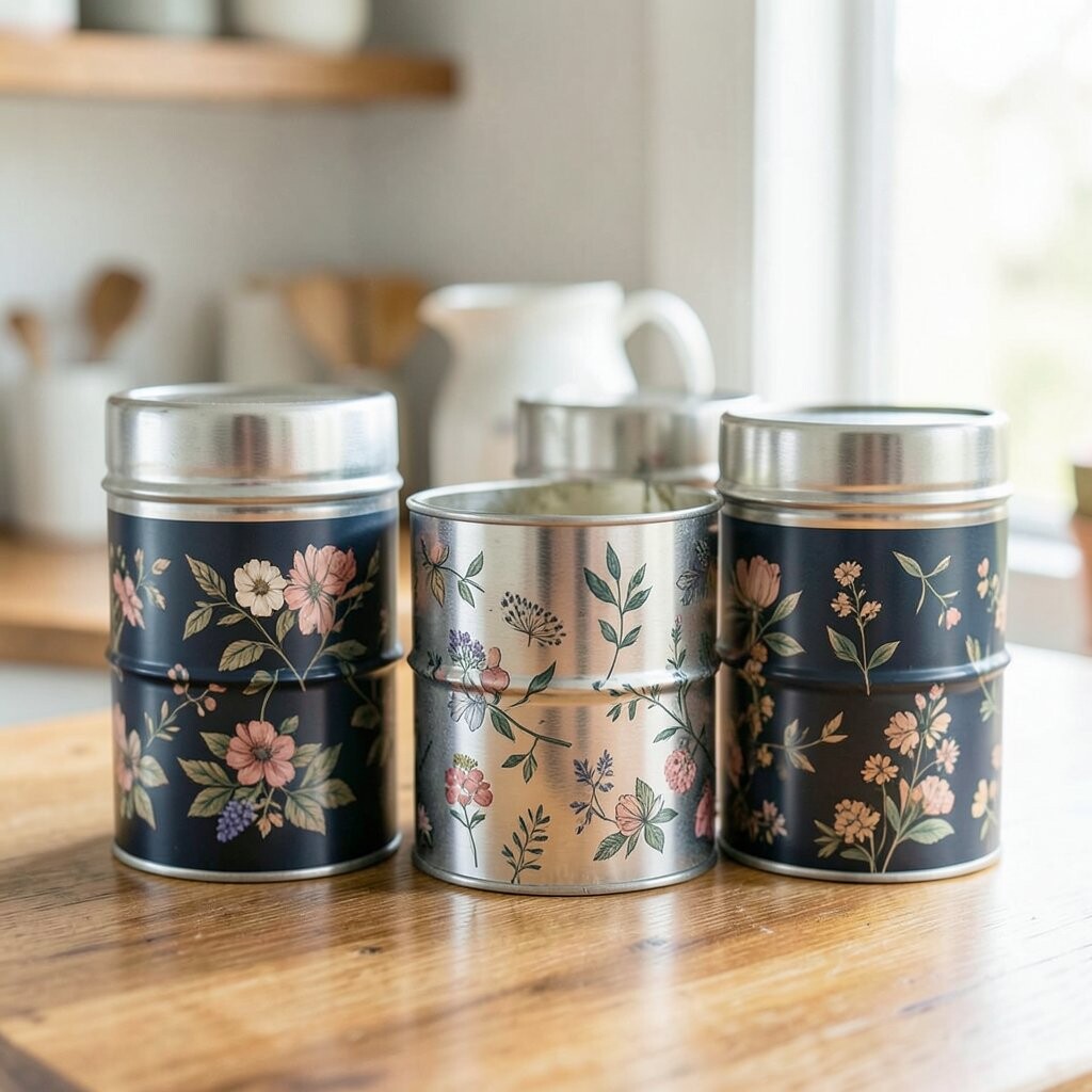 Patterned Tin Canisters Patterned tin canisters bring a pop of personality to your kitchen. They’re cheerful and add a splash of color to your decor.