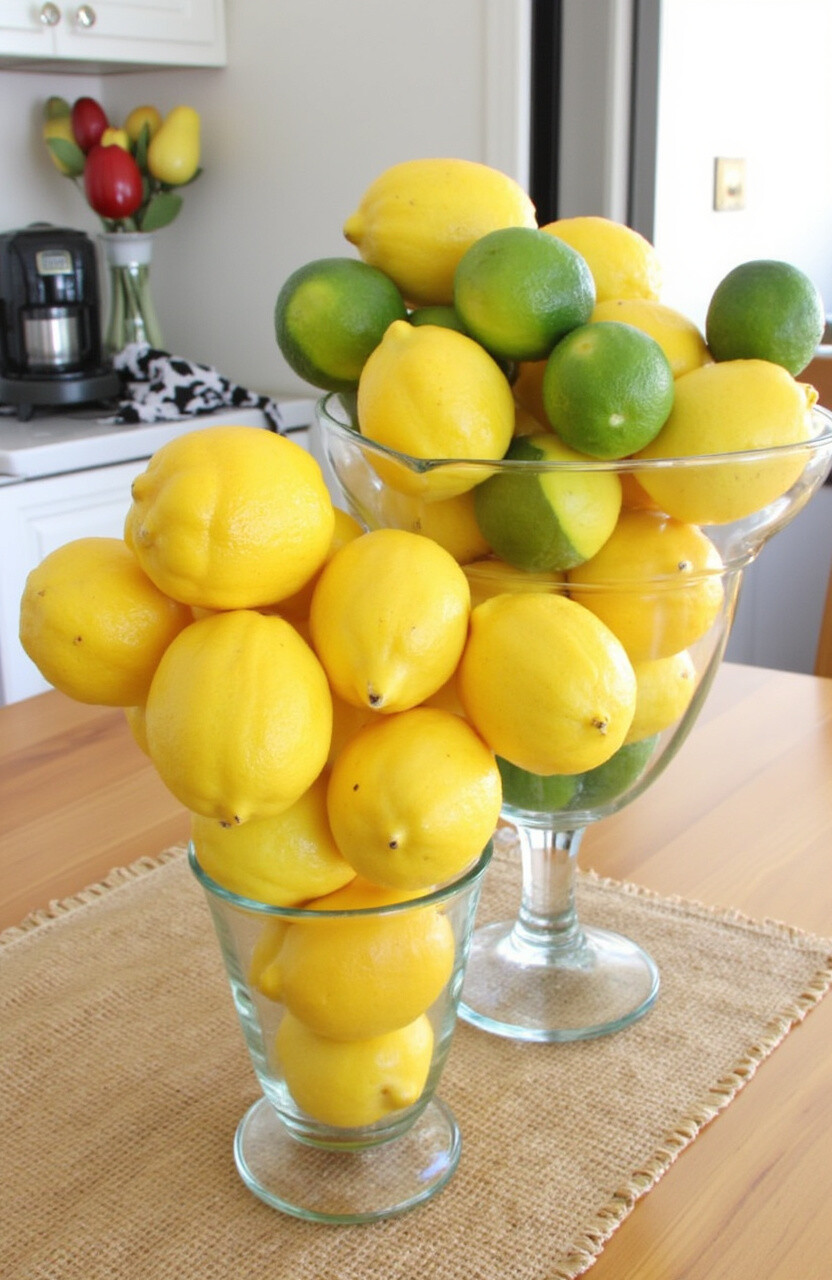 Use lemons and limes to create a charming lemonade stand display in your kitchen or dining area. Arrange them in glass containers for a refreshing look.