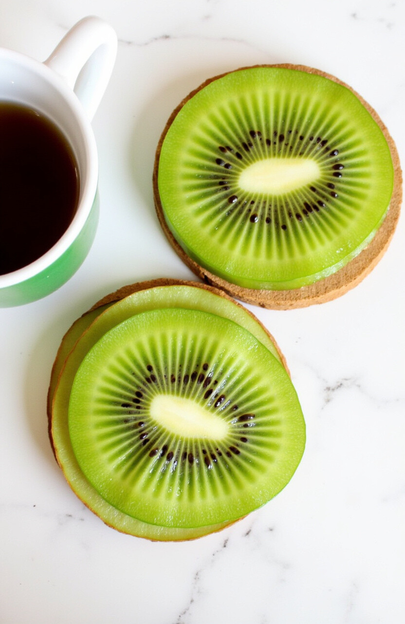 Slice kiwis into thin rounds and dry them to create unique coasters. Their vibrant green color and interesting patterns make them a stylish choice.