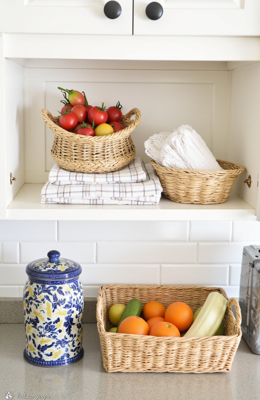 Select baskets in various sizes and materials for a layered look. They’re an affordable way to enhance your kitchen’s design.