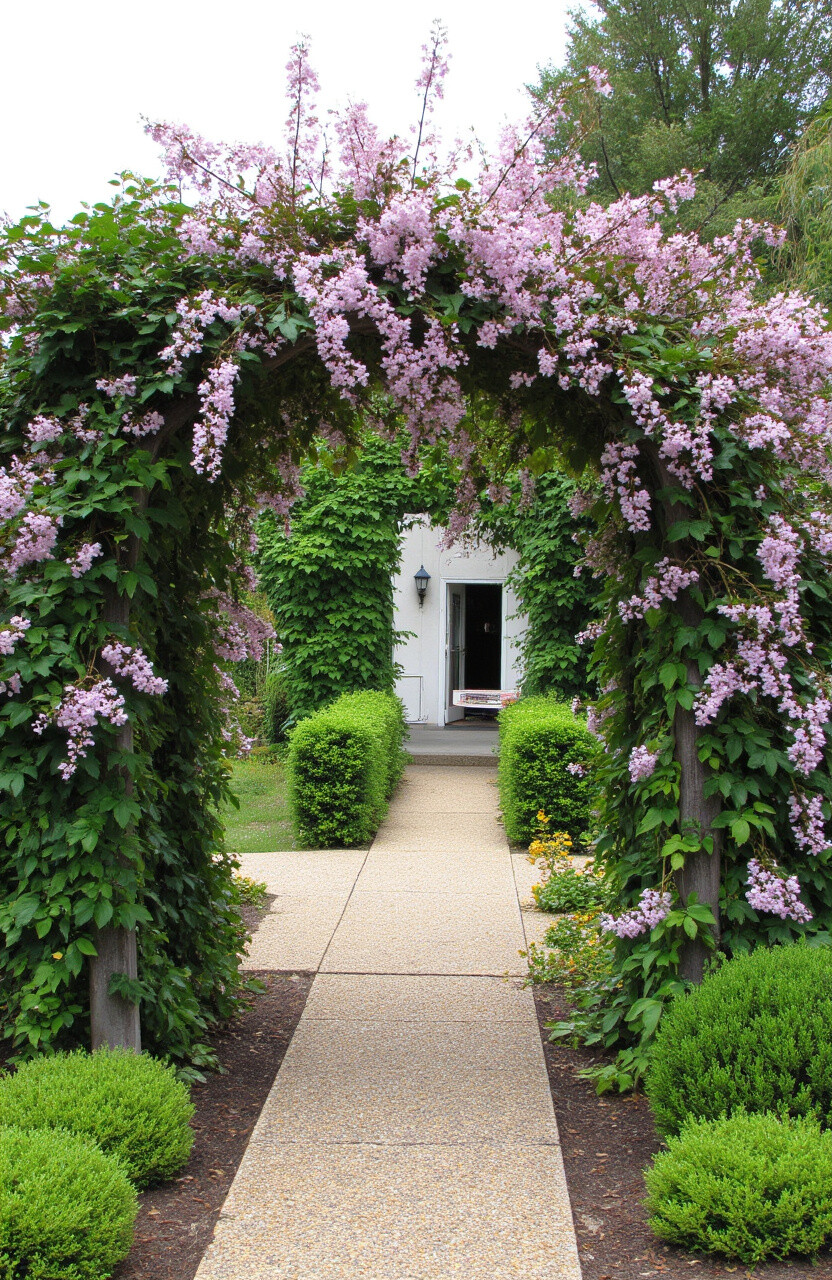 Create a stunning entrance with a flower-covered archway. Roses or wisteria can add a romantic touch.