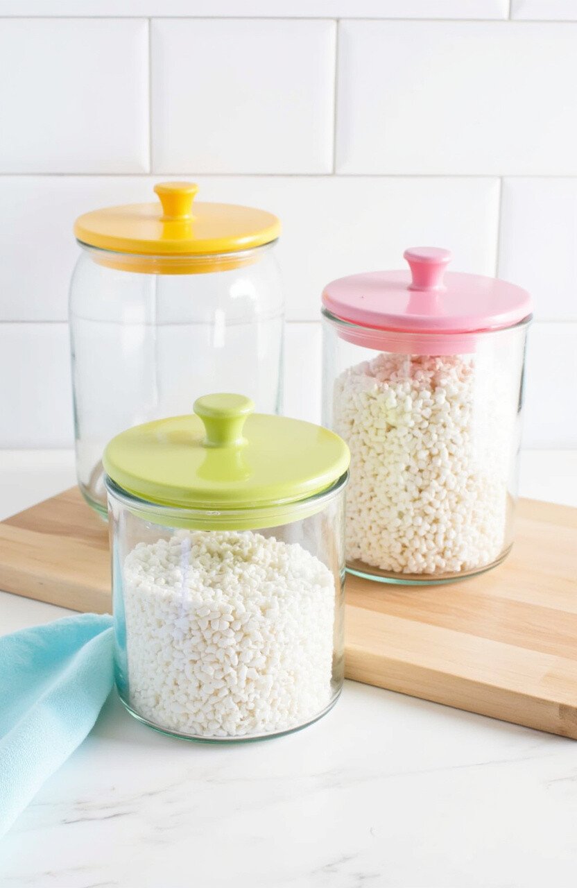 Add a pop of color to your kitchen with colored lids. These canisters are perfect for adding a playful touch to your decor.