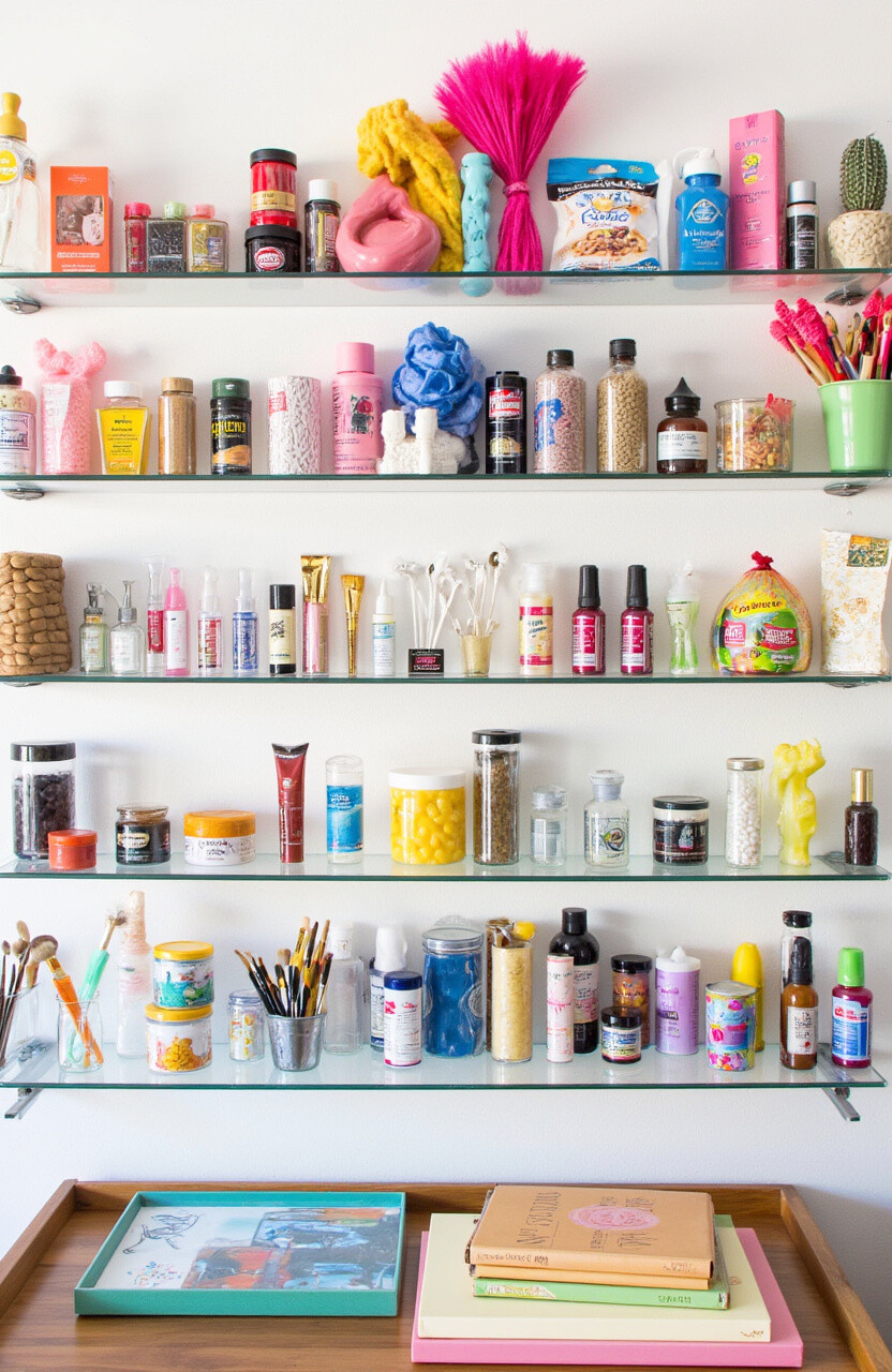 For the creative souls, glass shelves can hold all your craft supplies. From yarn to paintbrushes, display them in a colorful and organized way.