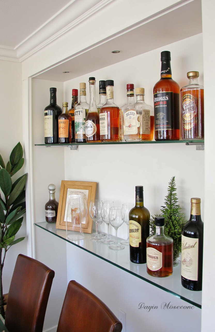 If you enjoy a good drink, why not show off your favorite bottles? Glass shelves can turn your liquor collection into a classy display. Add some glasses and a shaker for a complete bar look.