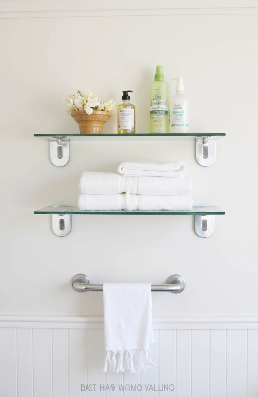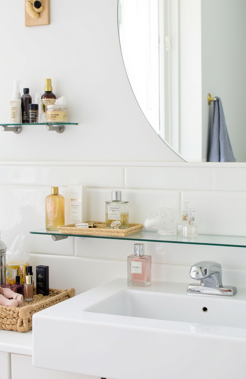 Use glass shelves to create a chic bathroom vanity. Display perfumes, lotions, and makeup in an organized way.
