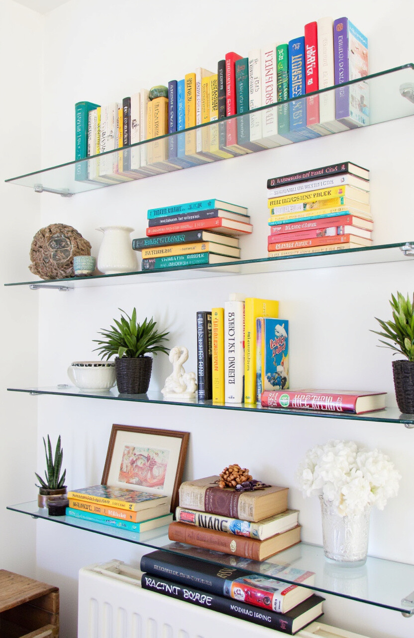 Books never looked so stylish. With glass shelves, your book covers become the art. Try arranging books by color for a rainbow effect. It’s a fun and creative way to add personality to your space without spending a lot!