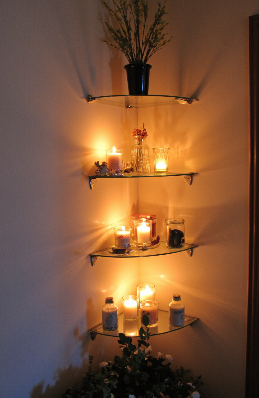 Fill your glass shelves with candles of different sizes and scents. Lighting them in the evening creates a warm, inviting atmosphere. The glass reflects the candlelight, amplifying the cozy vibes.