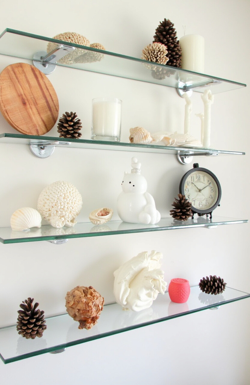 Use glass shelves to change your decor with the seasons. In winter, display pinecones and small ornaments. In summer, switch to seashells and bright colors.