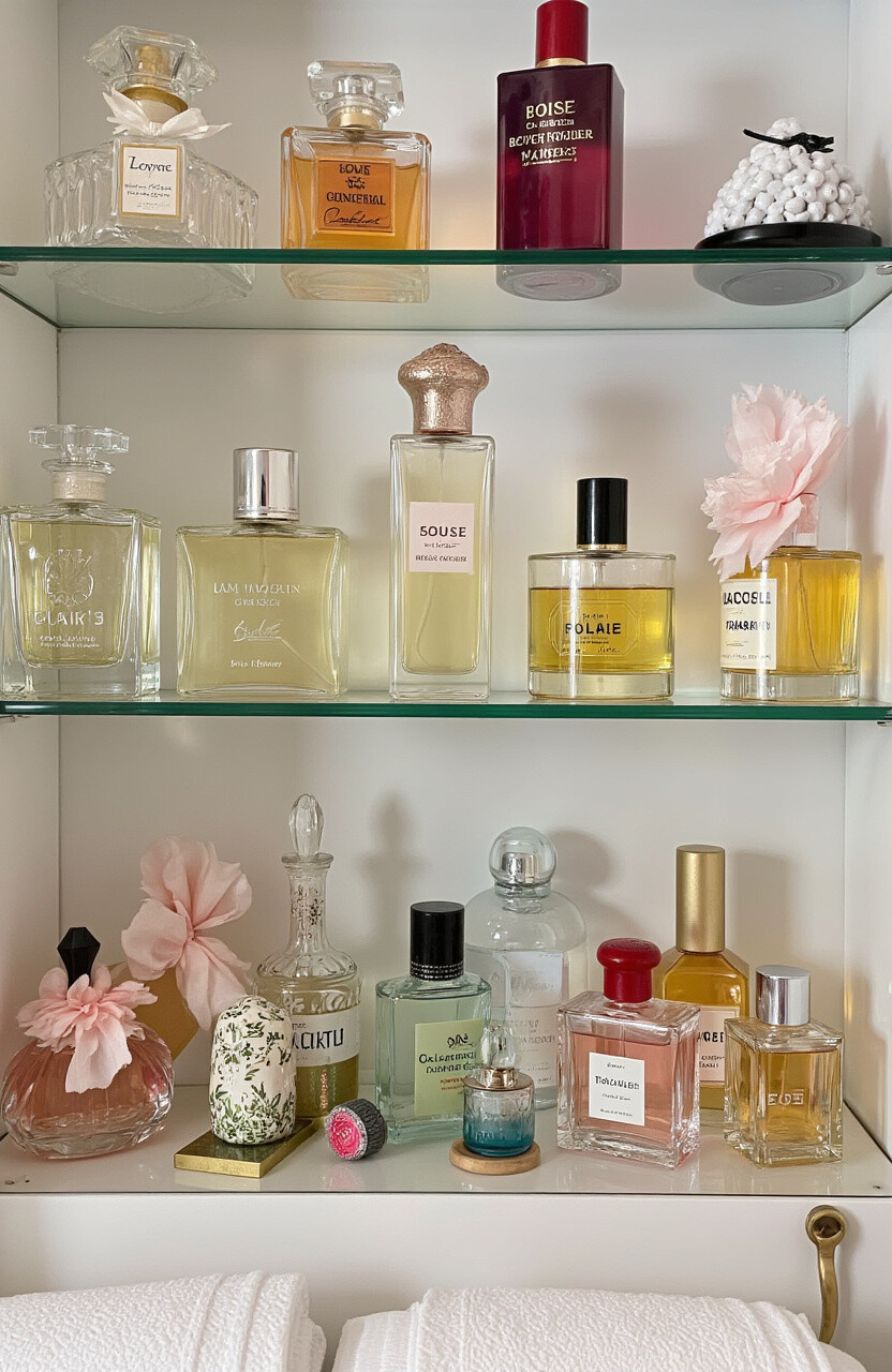 Perfume bottles are often too beautiful to hide away. Display them on glass shelves in your bedroom or bathroom. The light will catch the bottles, making them sparkle like jewels.