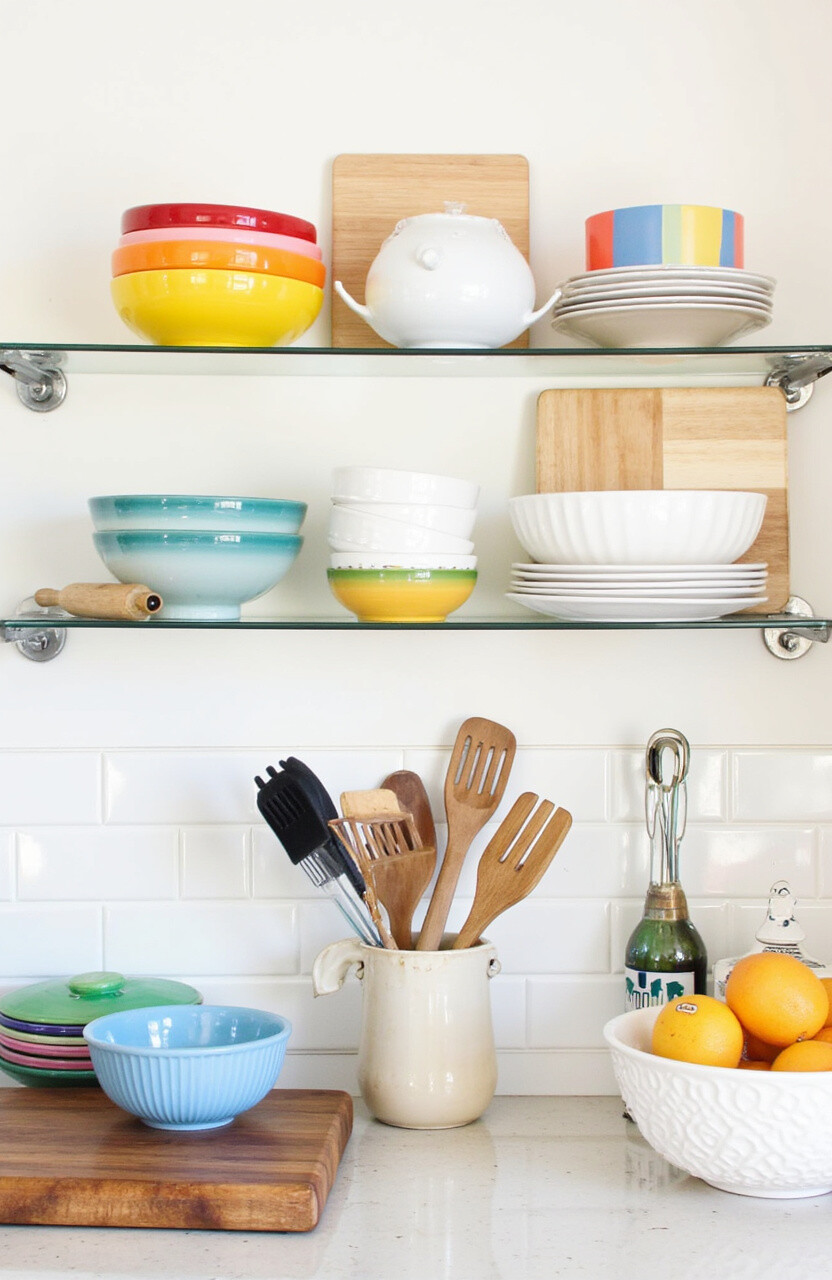 Bring style to your kitchen by arranging utensils on glass shelves. Display items like rolling pins, cutting boards, and colorful bowls.