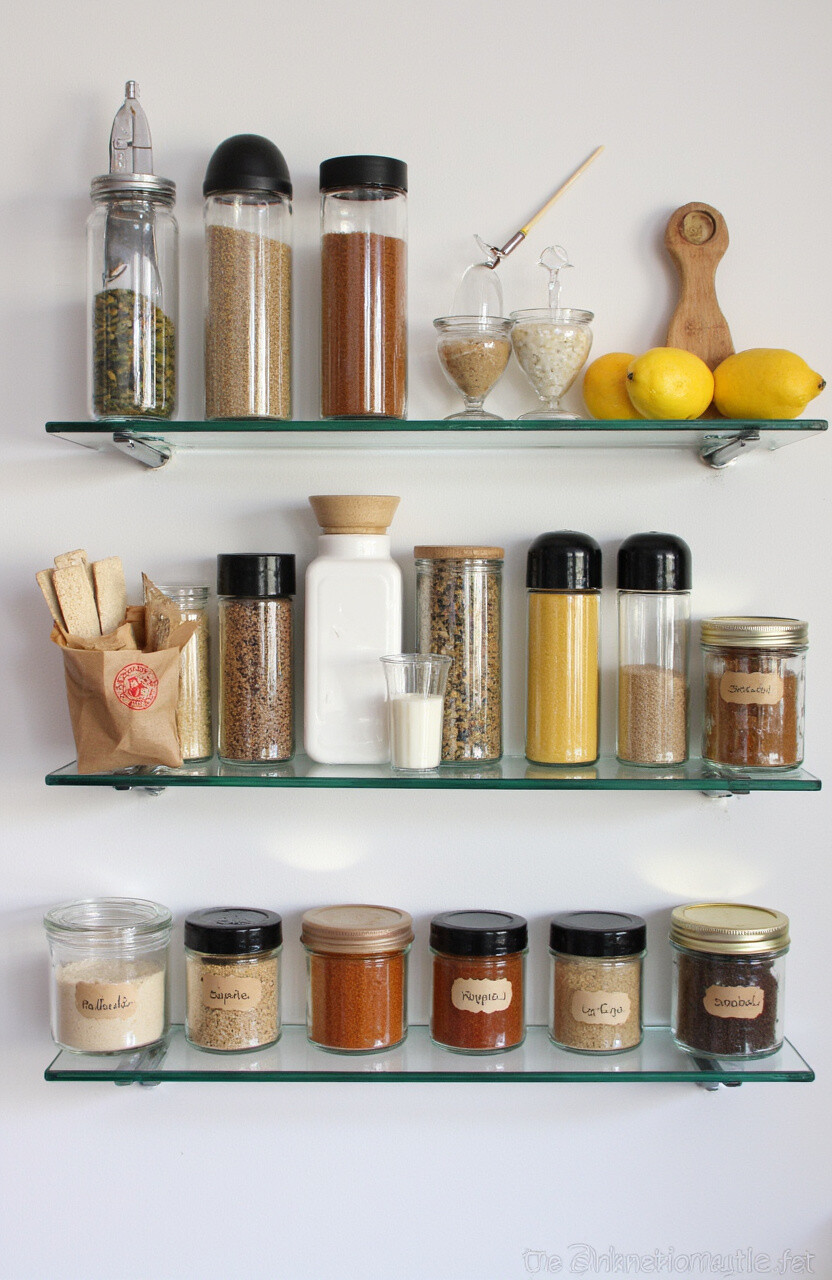 Organizing spices on glass shelves can make your kitchen look neat and chic. Plus, it adds a splash of color, making the space more inviting. Try labeling jars for that extra touch of organization!