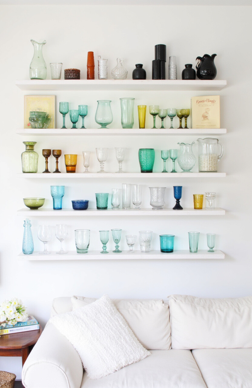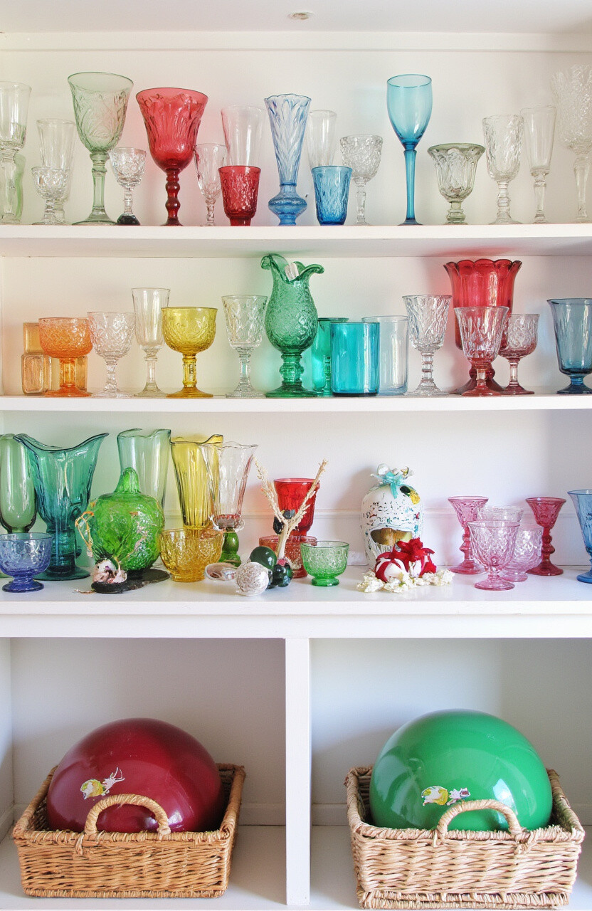 Organize your glassware by color for a visually pleasing display. Use shelves or a cabinet to arrange the pieces by hue, creating a rainbow effect. This method adds a lively splash to any room.