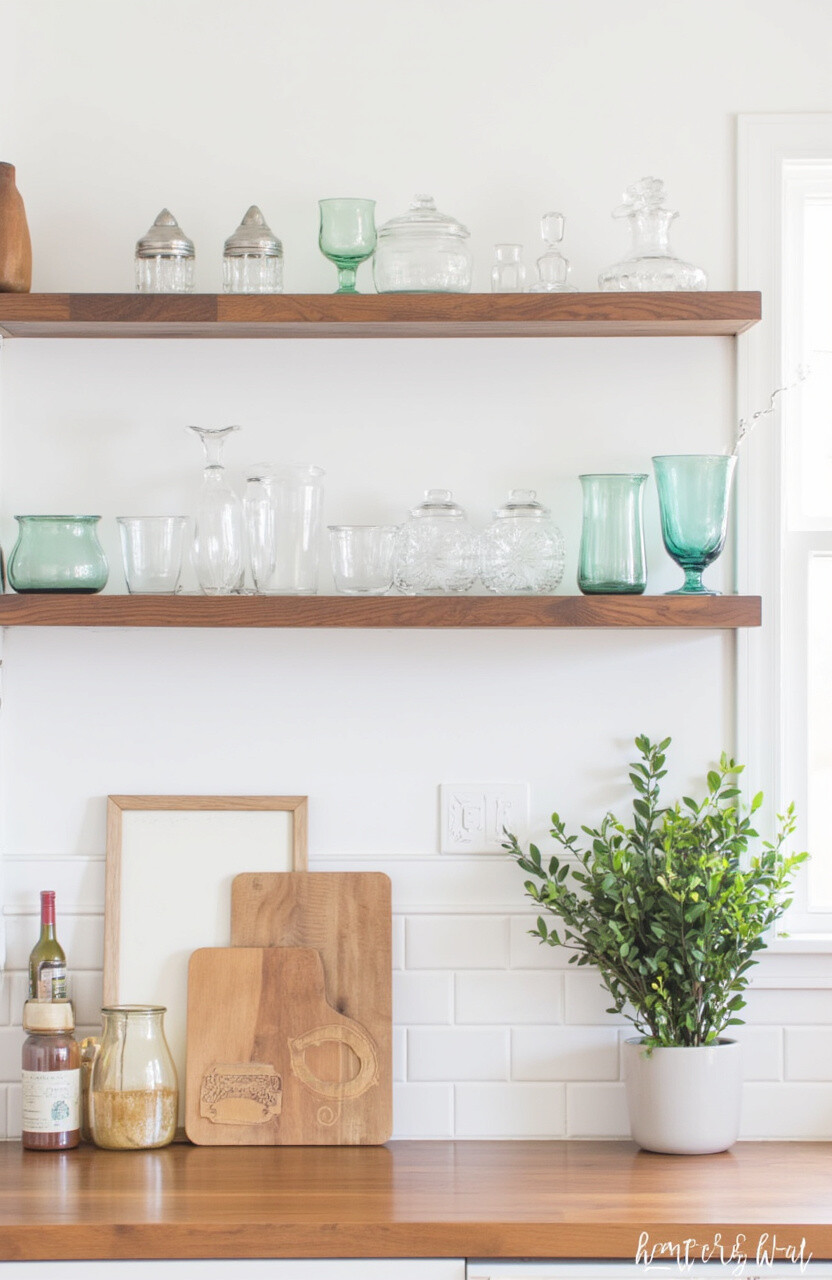 This is a low-cost solution that can make your kitchen look modern and airy. Keep it organized by grouping similar items together. Consider seasonal rotations to keep the display fresh.