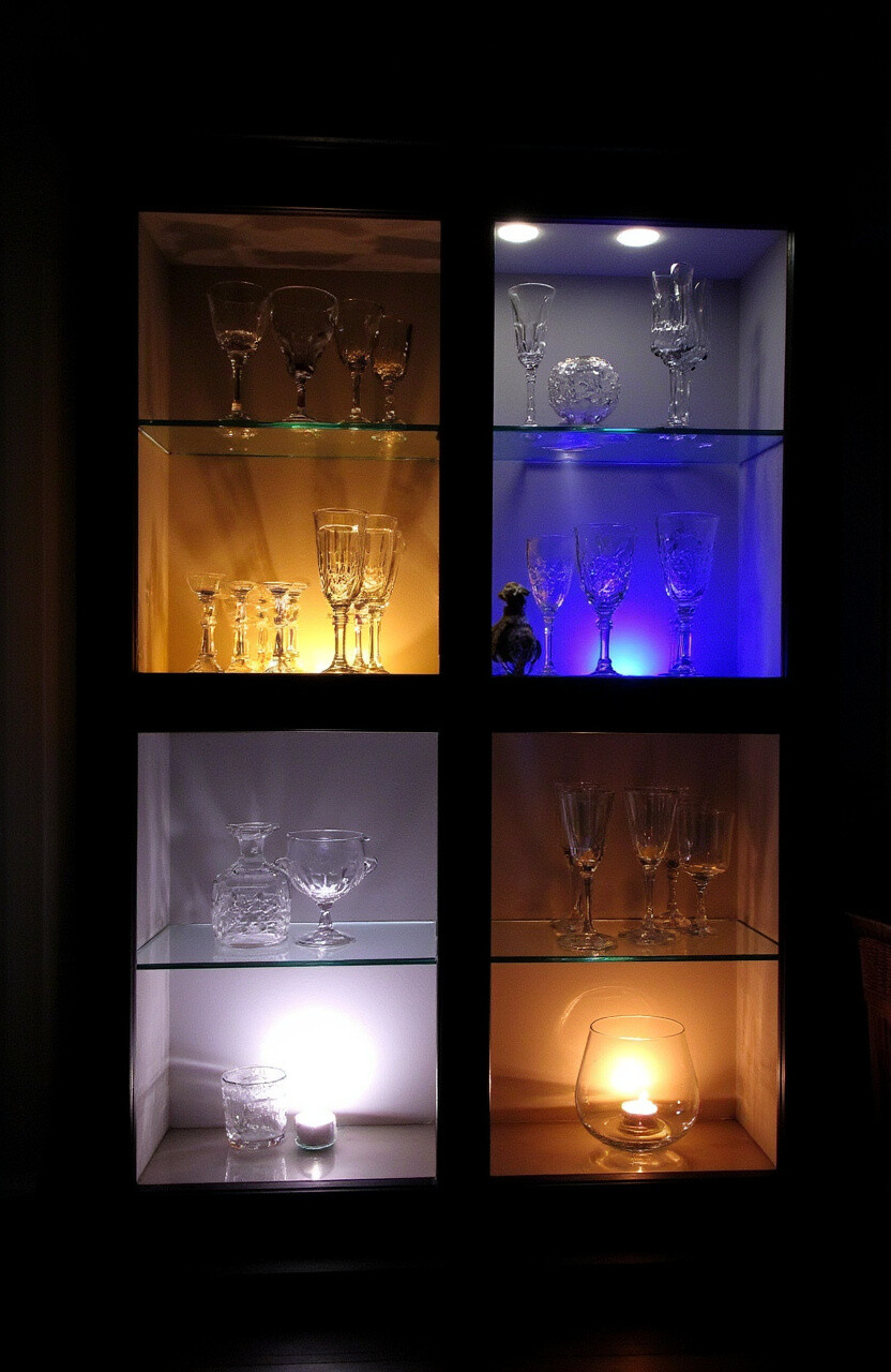 Create a dramatic display with lighted boxes for your glassware. Install LED strips inside shadow boxes or shelves for a glowing effect. This works well for evening entertaining or dimly lit rooms.